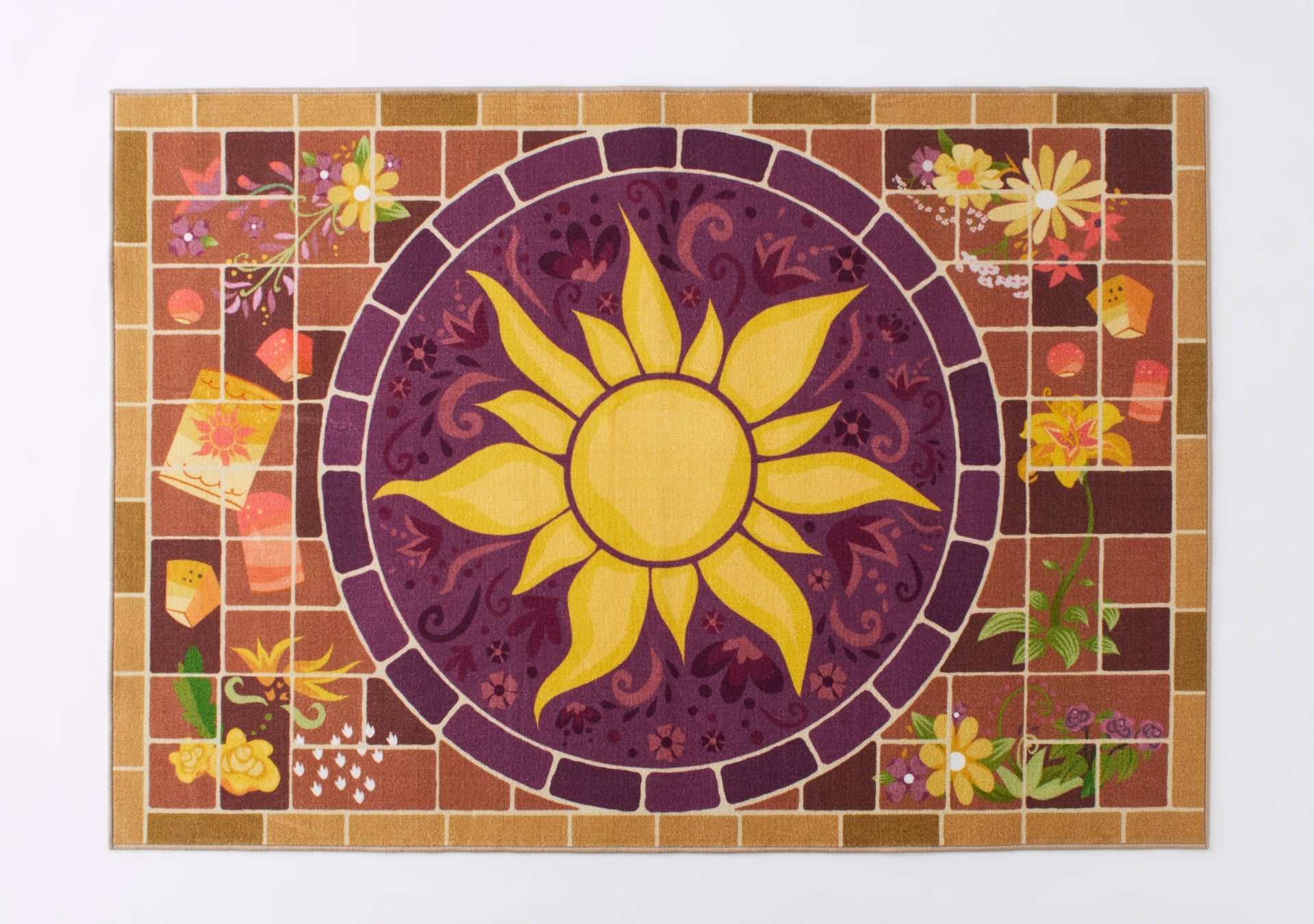 『塔の上のラプンツェル』で、「ラプンツェル」が踊る石畳の広場をモチーフにしたラグです。物語に登場する王国の紋章と石畳風のデザインをしています。こちらも短い毛足でお掃除がしやすい仕様です。