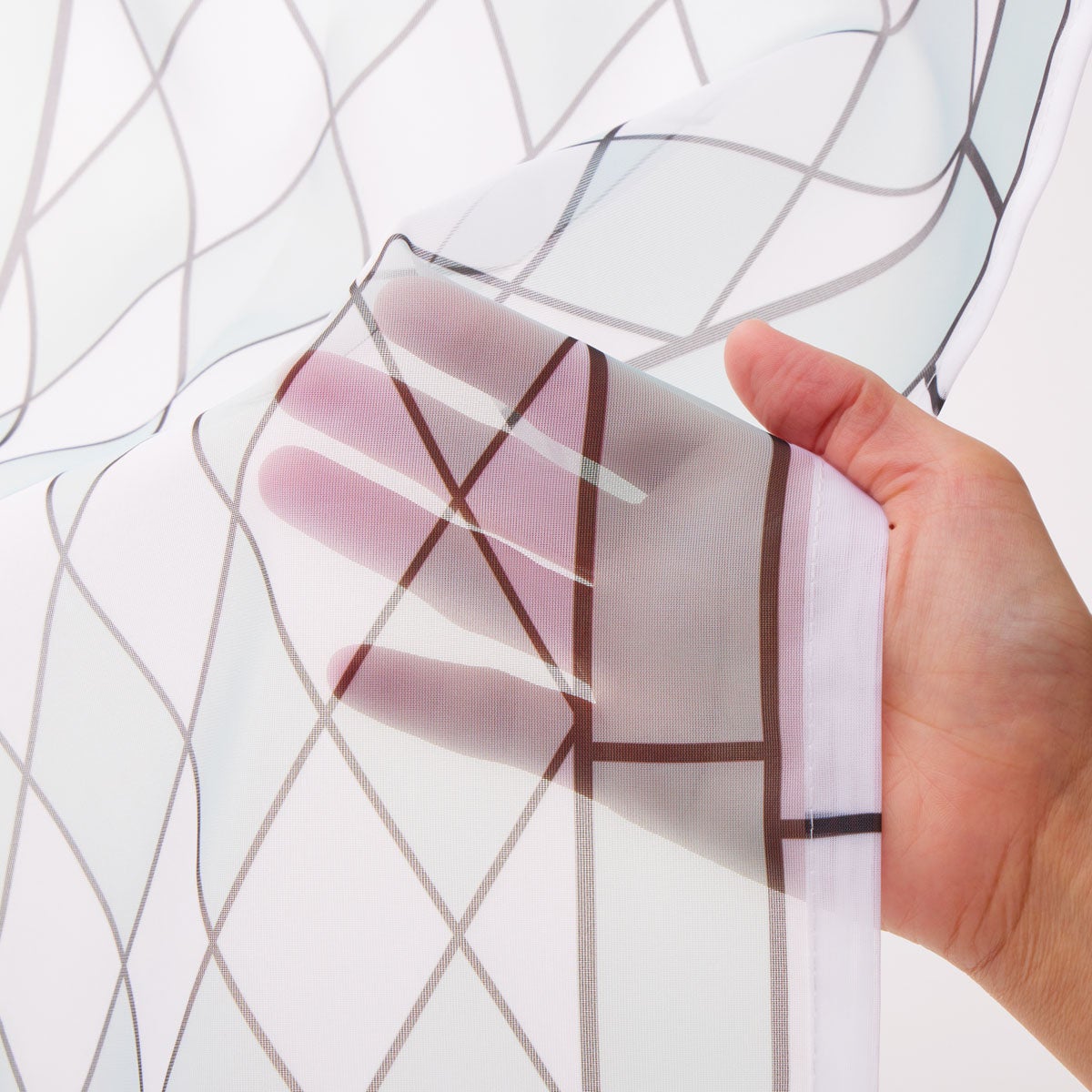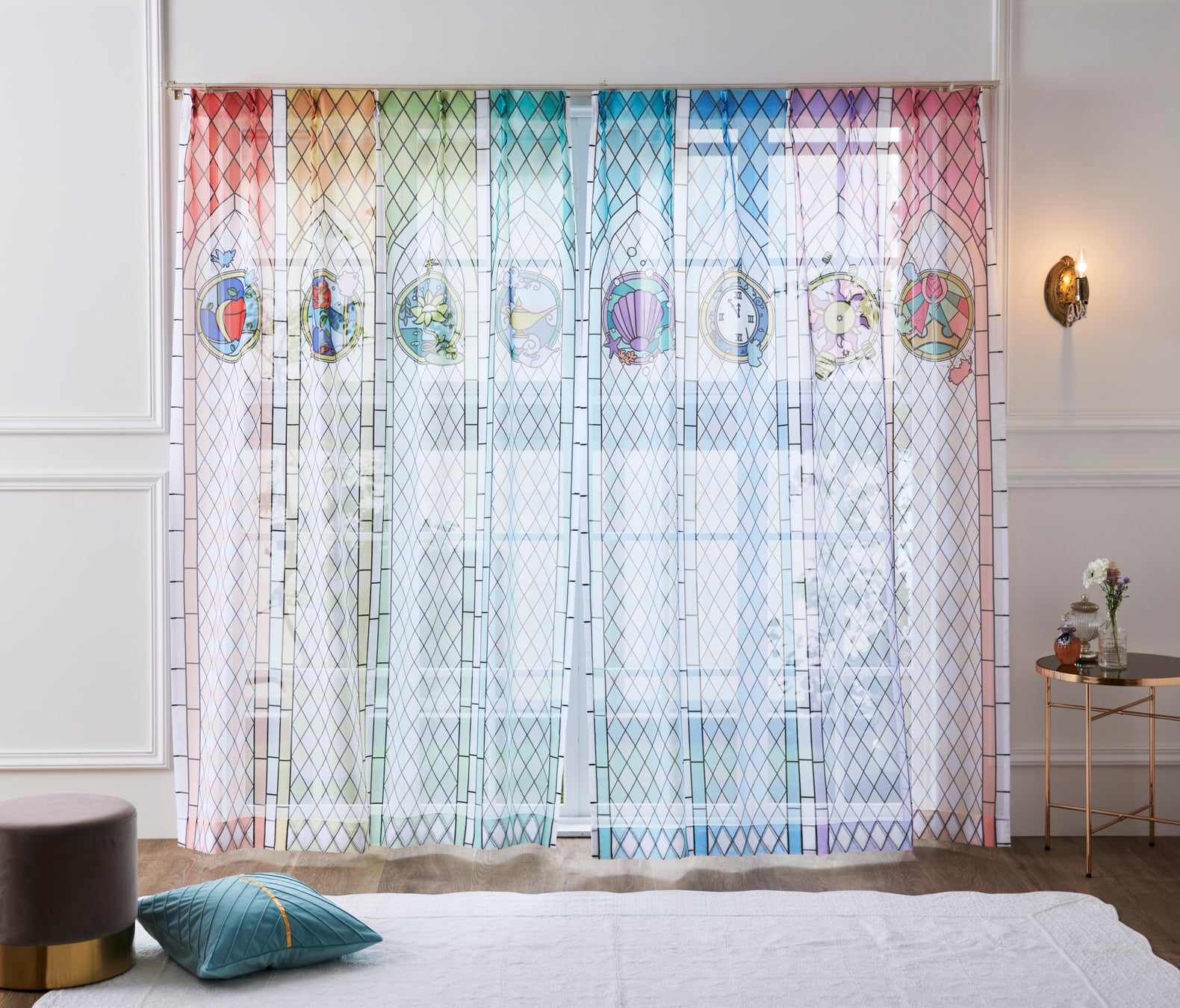 光に当たるとステンドグラスのように淡い色の模様が浮かび上がる、美しいレースカーテンです。透け感のある軽やかなボイル生地を使用しており、風に揺れる様子は、まるで物語の世界にいるかのような雰囲気を演出します。カーテンの上部には『美女と野獣』に出てくるバラや、『シンデレラ』に登場する時計とガラスの靴など、ディズニープリンセスをテーマにした8つの物語のモチーフがプリントされ、それぞれの物語を彷彿させる色合いに仕上げています。