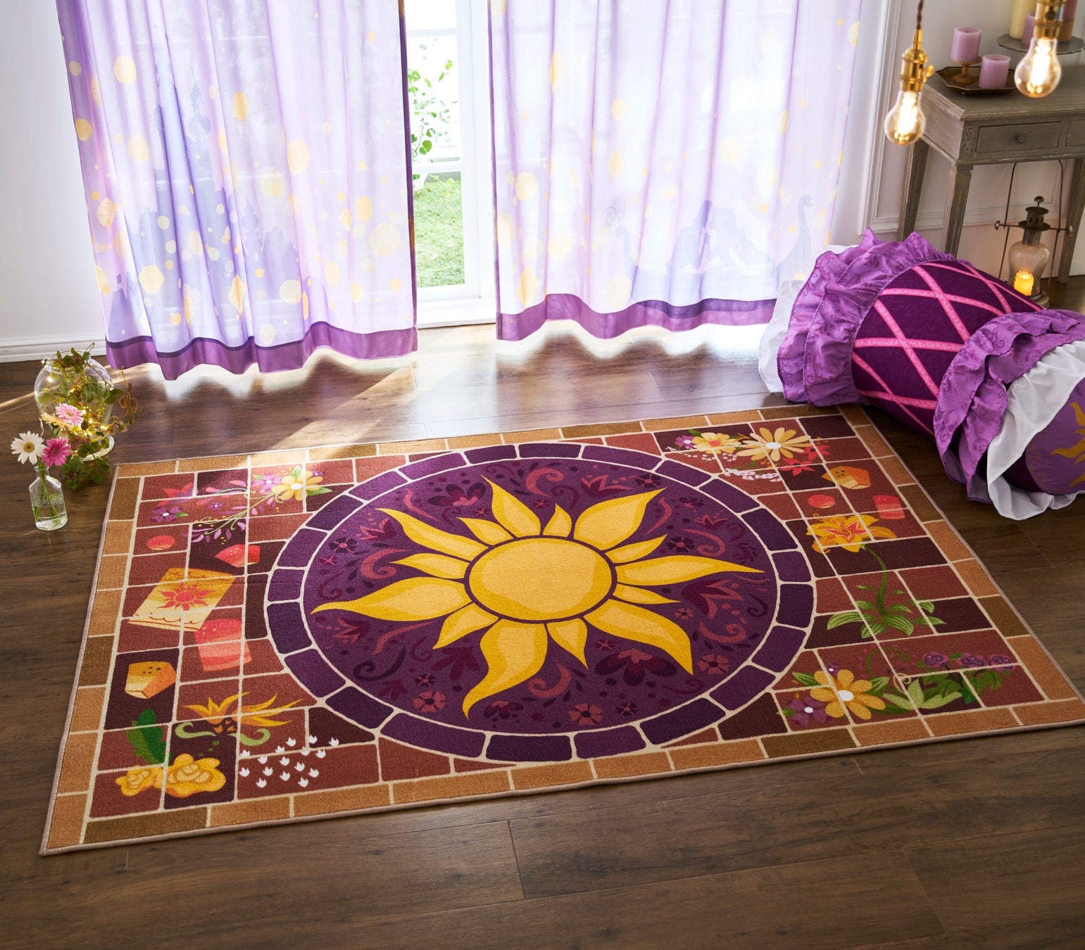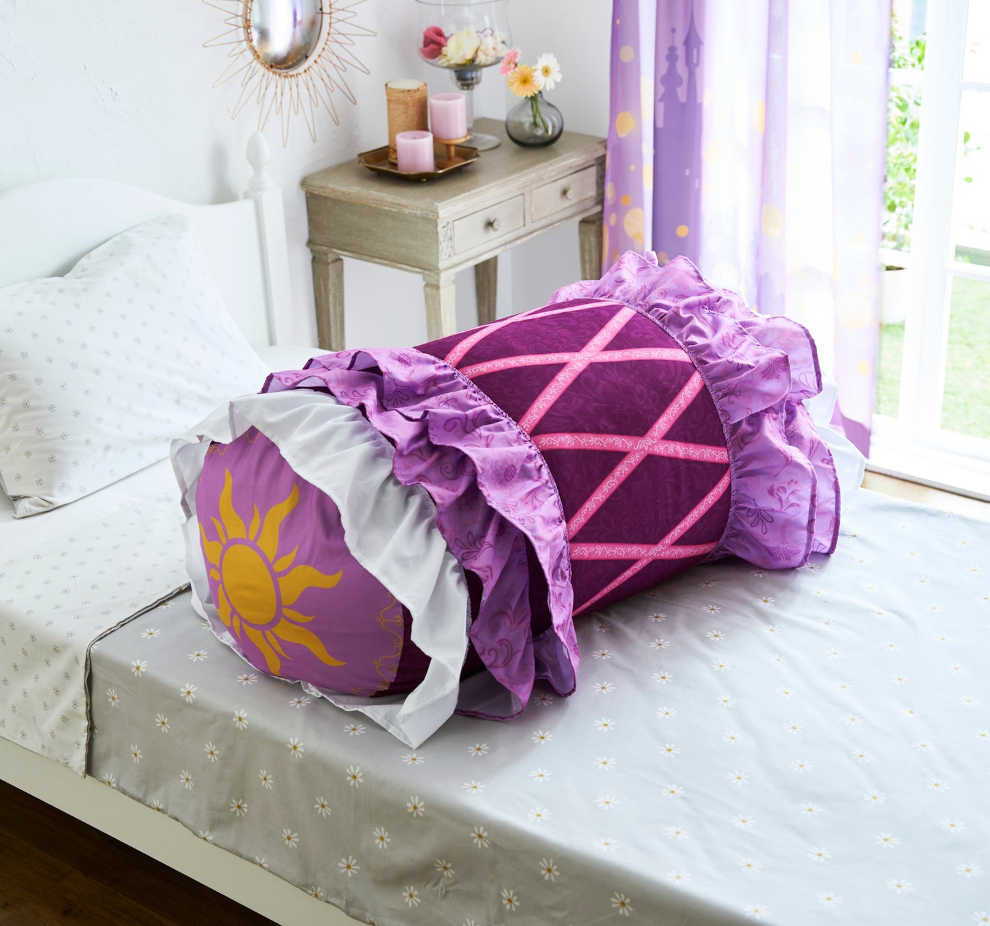また、布団を収納すると「ラプンツェル」のドレスのようなクッションに変わる「ドレス風布団収納ケース『ラプンツェル』」や、有名なランタンのシーンが美しく描かれた「一枚絵のようなUVカット・遮熱・ミラーレースカーテン『ラプンツェル』」(販売中)と組み合わせれば、物語の世界観をお部屋全体で楽しむことができます。