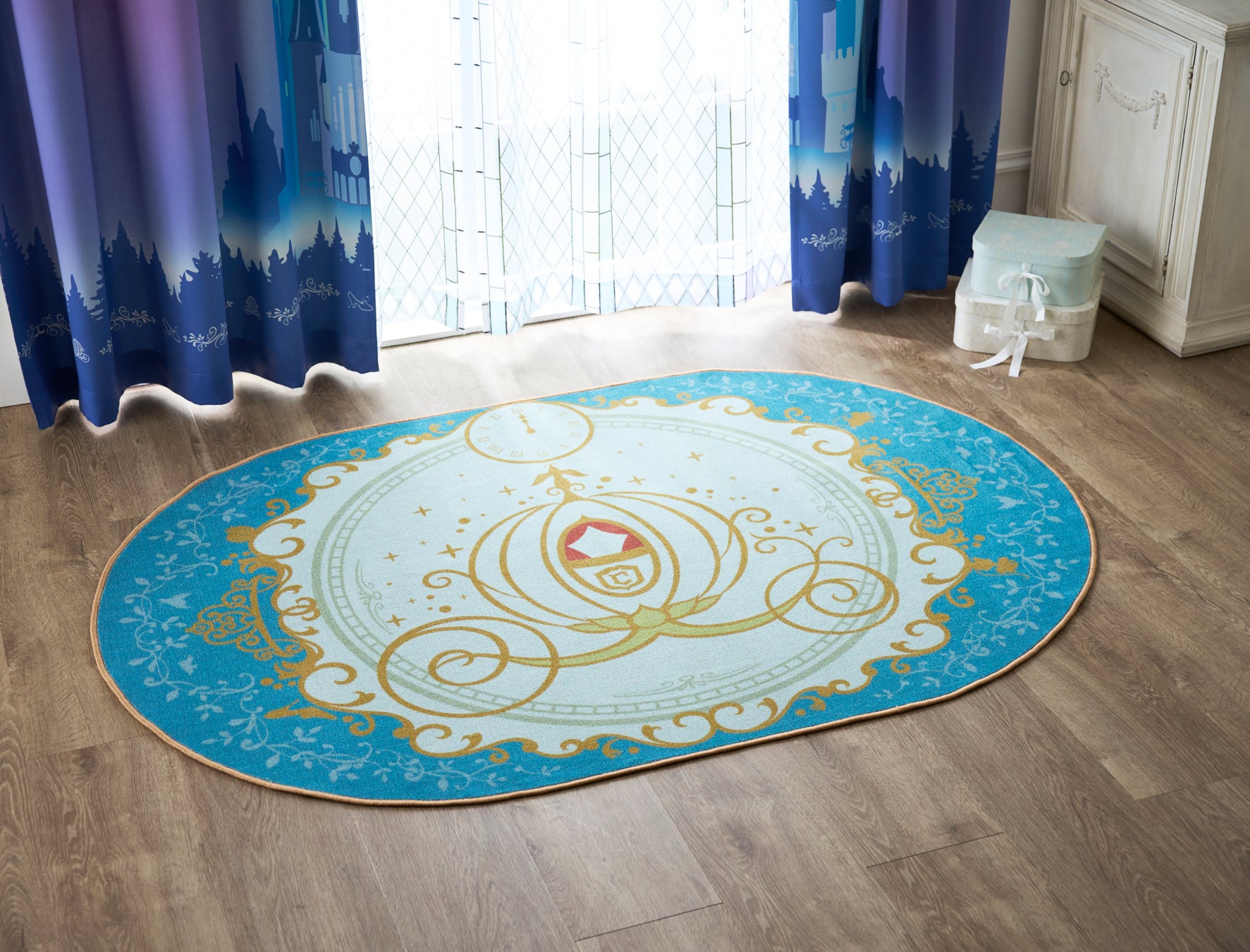 『シンデレラ』に登場する魔法のかぼちゃの馬車をイメージした楕円型の美しいラグです。馬車の上には12時を示す時計をデザインし、物語に登場するさまざまなモチーフを散りばめました。毛足が短いため、掃除がしやすい仕様です。