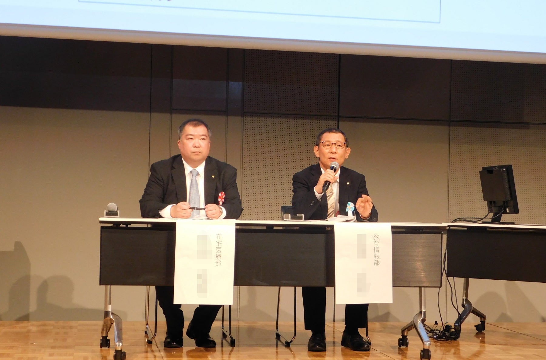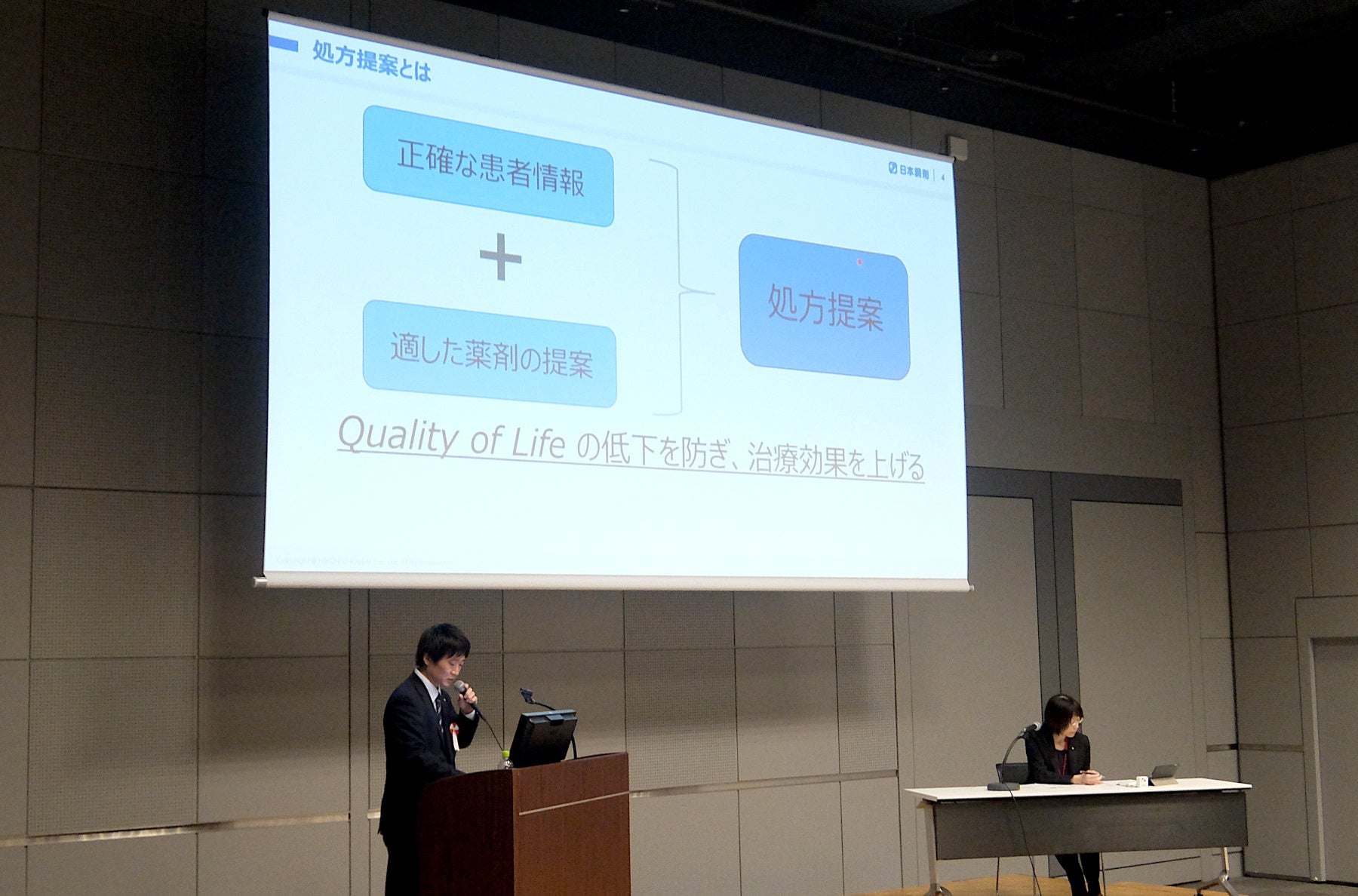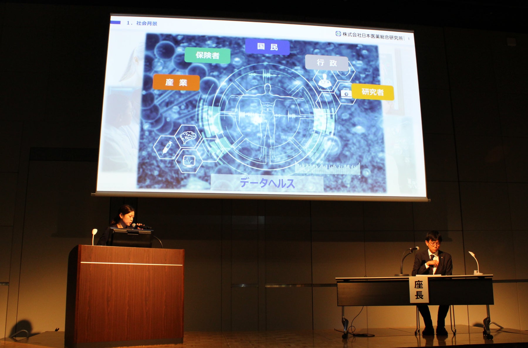 そして特別講演では、データヘルス支援サービスなどを展開する当社グループの日本医薬総合研究所の社員が登壇し、保険者のレセプトデータ分析から見える重複投薬などの症例・実態や、医療費適正化と上手な医療のかかり方の普及・啓発に向けた、日本調剤グループ間の連携に関する展望などについての講演を行いました。