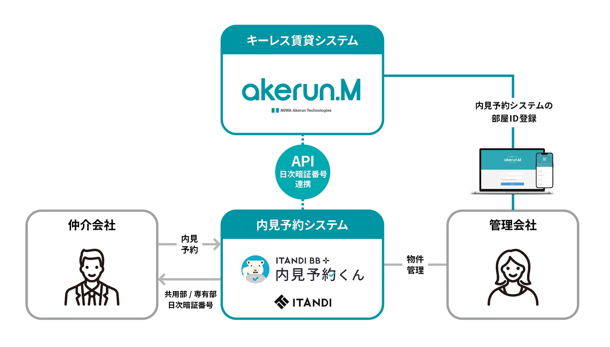 (※1)本連携サービスの利用には、MIWA Akerun Technologiesの「Akerun.Mキーレス賃貸システム」およびイタンジの「内見予約くん」の契約・導入が必要です。