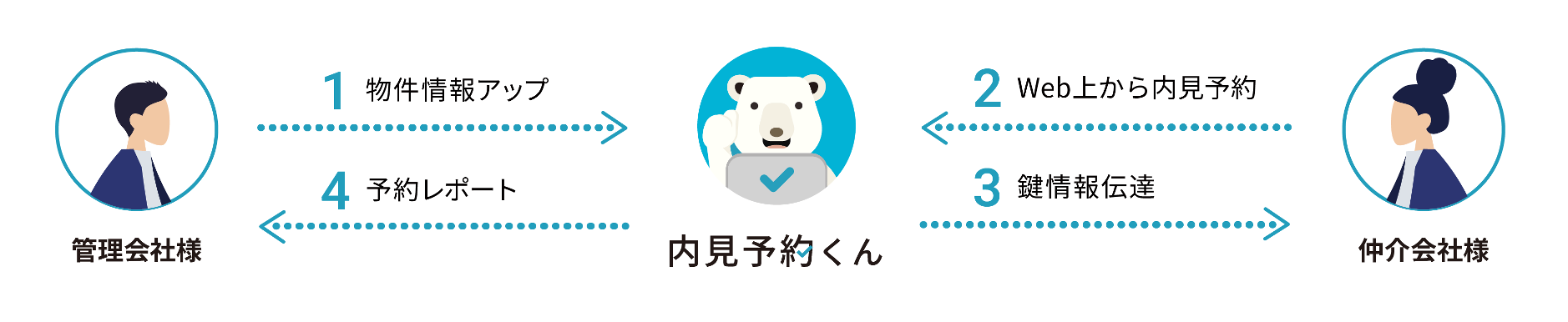 内見予約の受付作業や鍵情報の照会作業を自動化することで、24時間365日いつでも内見予約をすることができる、仲介会社利用率93.8%(※4)の賃貸住宅の内見予約受付システムです。内見予約の自動化により、賃貸不動産管理会社は業務を効率化し、予約重複等のトラブルを防ぎます。また、宅建業を許可されていない不正業者の自動チェック機能もあり、犯罪の抑制にも貢献します。入居希望者にとっては素早く効率的に希望の部屋を内見できるようになり、利便性が向上します。