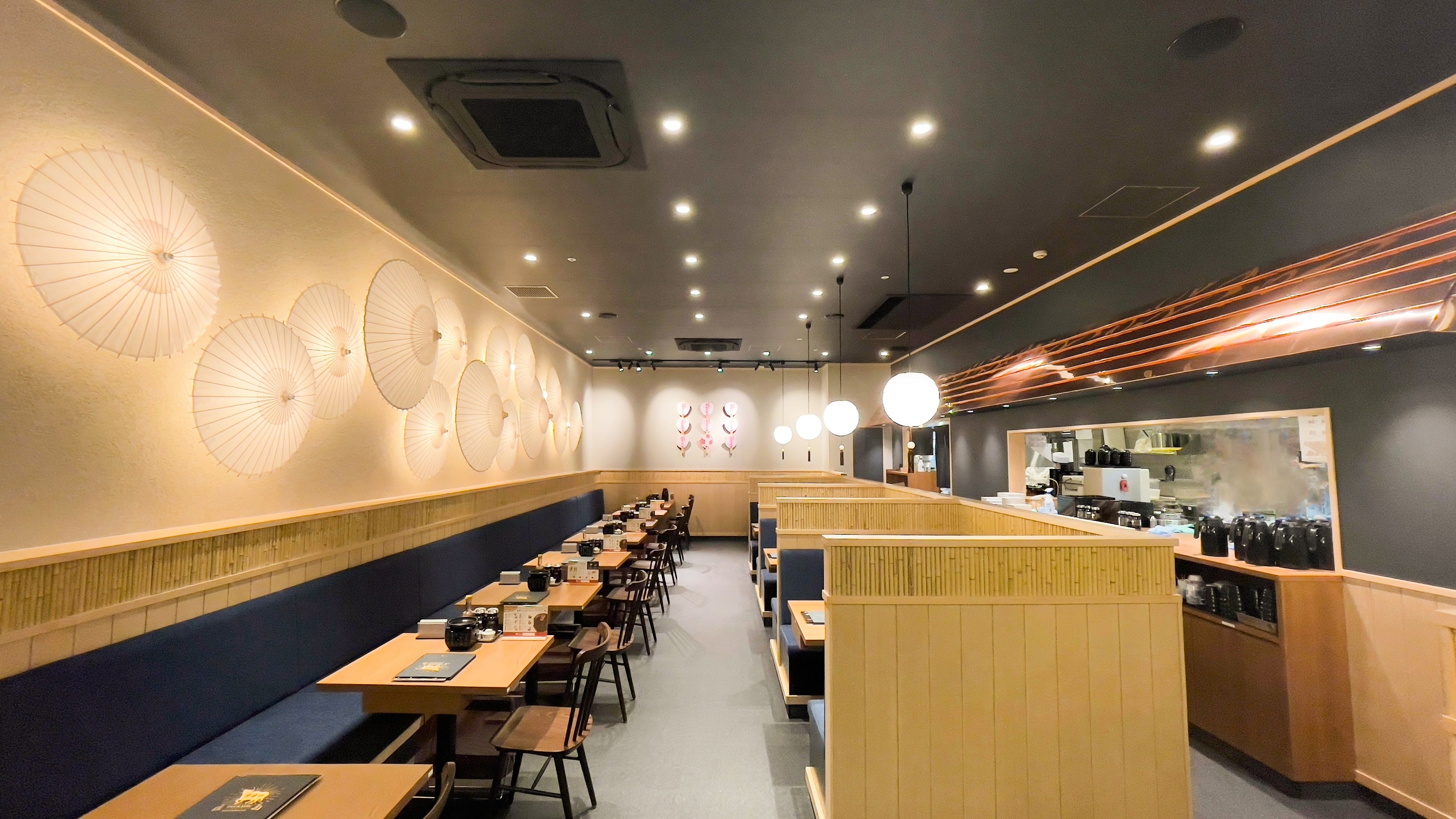 白木をベースとした落ち着いた空間に、和傘をモチーフとした印象的な壁面アートを配置。和傘の重なりが生み出す淡く優しい光のコントラストをお楽しみいただけます。また、カップルやご友人とご利用しやすい2名テーブルと、ご家族などのグループ利用に最適な広々としたテーブル席をご用意し、幅広い用途でごゆっくりお食事をお楽しみいただけます。