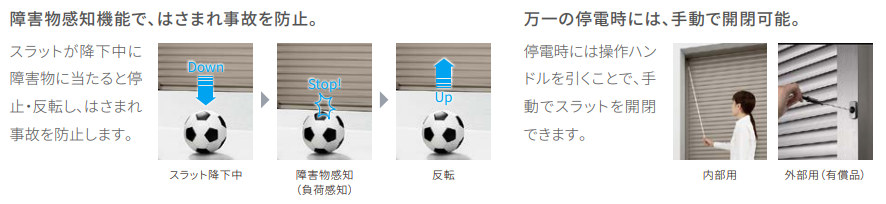 開スピード125mm/秒(※3)を実現し、高さ2.2mのシャッターの場合およそ18秒で全開。手動シャッターと比べて静かに開閉するので夜間でも早朝でもご近所に気兼ねすることなく開閉できます。もちろん、障害物感知機能ではさまれ事故を防止し、万一の停電時は手動操作への切り替えが可能となっており、安心・安全にしっかりと配慮しています。