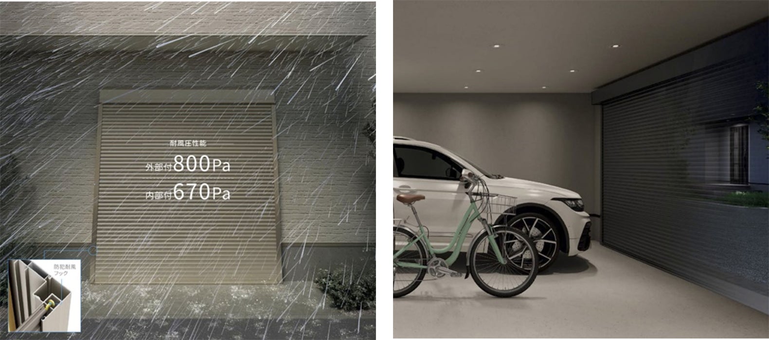 また、年々増加する台風・強風時の飛来物や、車上荒らしやいたずらからも車をしっかり守ります。防犯耐風フックを標準装備することで、スラットがガイドレールからはずれにくい構造となっており、優れた耐風圧性能(外部付800Pa・内部付670Pa)を実現しています。