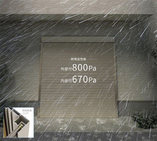防犯耐風フックを標準装備することで、スラットがガイドレールからはずれにくい構造となっています。これにより、優れた耐風圧性能(外部付800Pa・内部付670Pa)を実現。