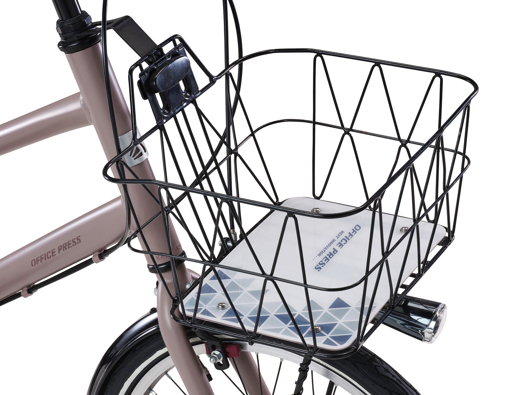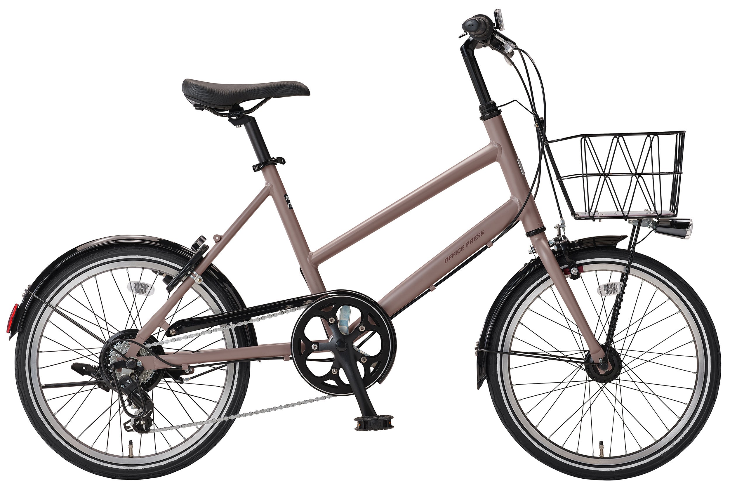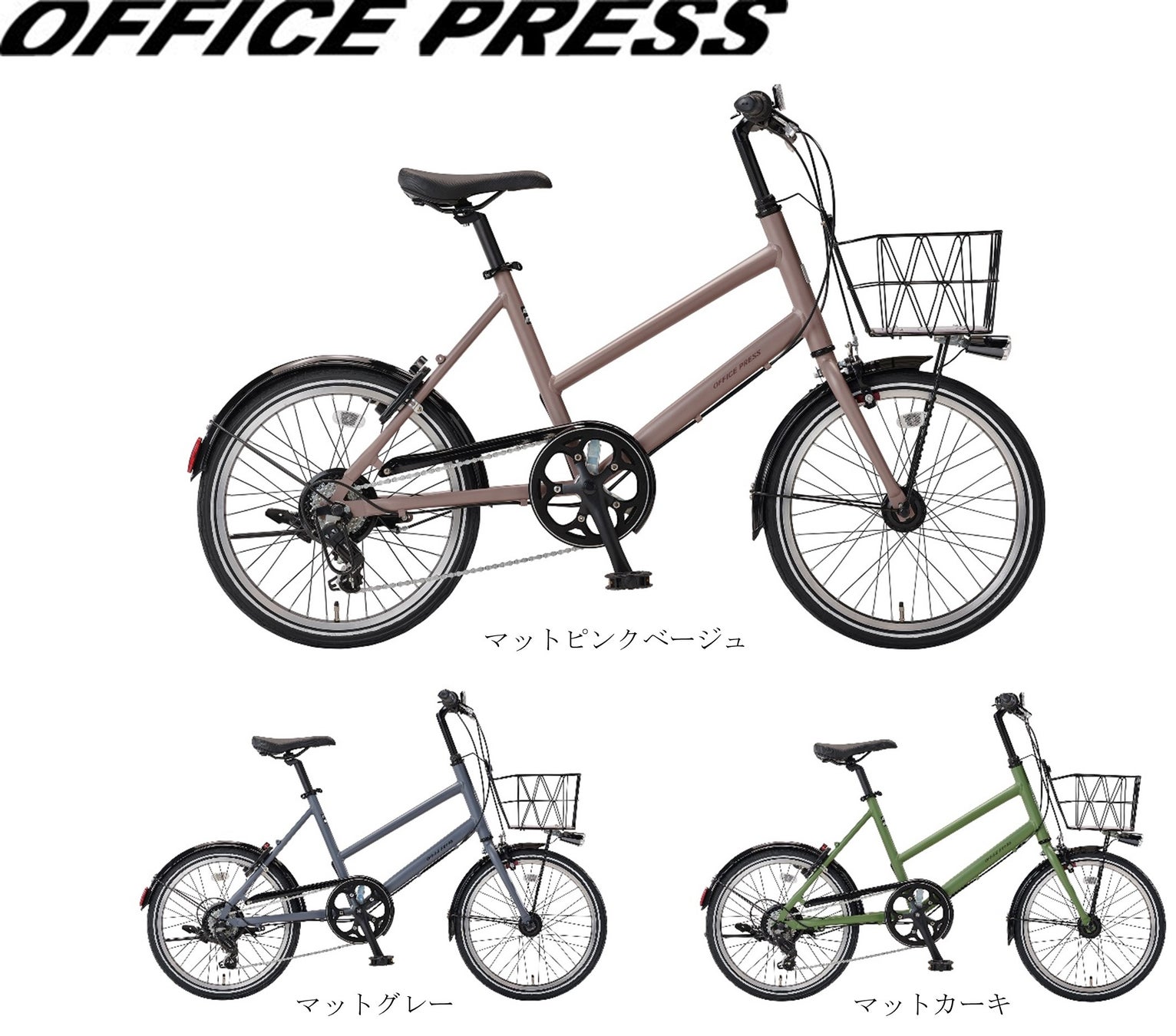 「オフィスプレスTM」は、軽快な走りと取り回しの良さが魅力の、女性にも扱いやすい小径モデルです。アルミ製の軽量なフレームに20インチのホイールを組み合わせたコンパクトで小回りの利く車体は、都市部の暮らしにもなじむ落ち着いたマットカラーの3色展開。デザイン性と実用性を両立し、夜道でも安心なLEDオートライト、手荷物の持ち運びに便利なフロントバスケット、裾汚れを防止するチェーンカバー、革靴やパンプスでも滑りにくいノンスリップペダルを装備しています。