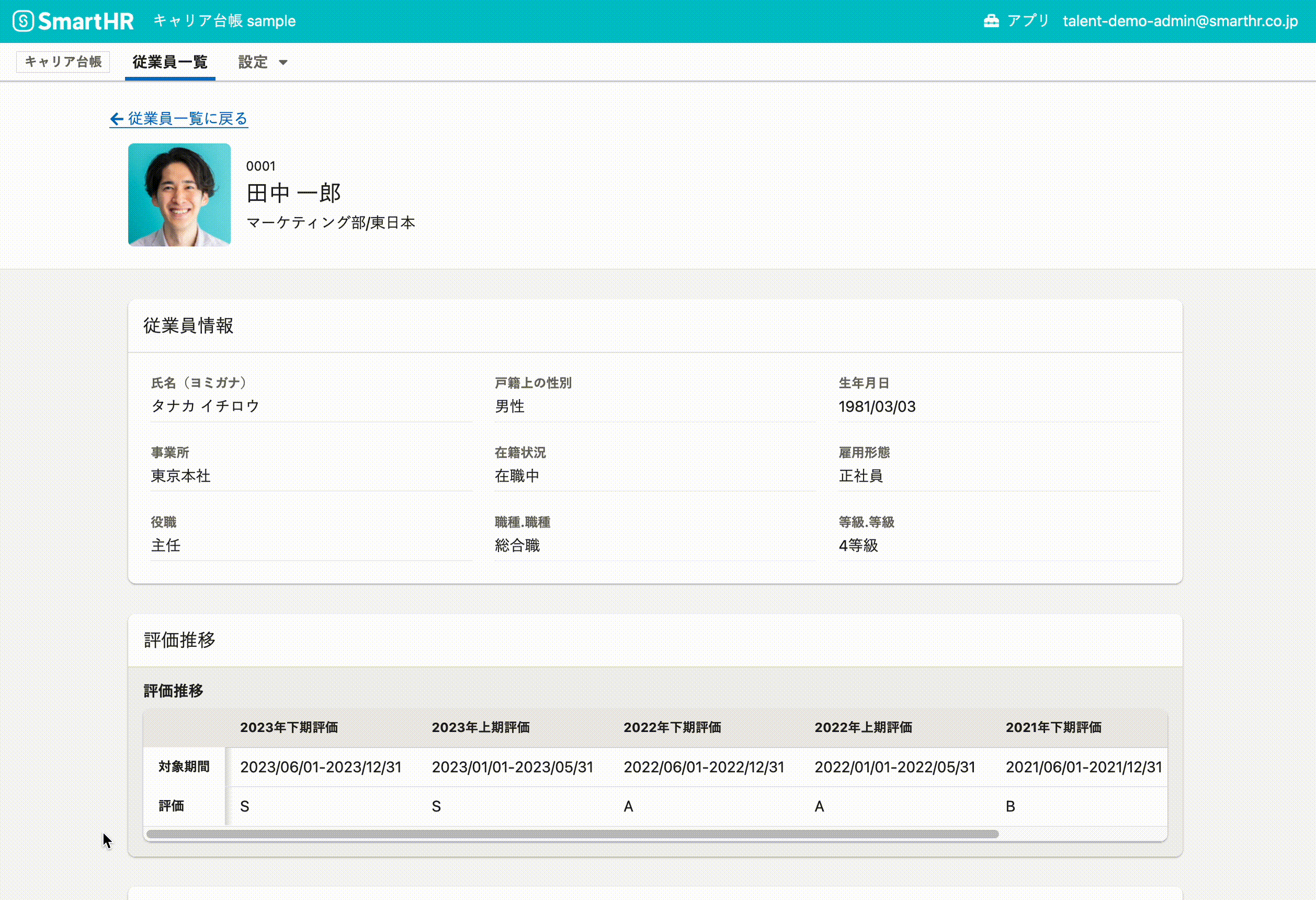 ・入社手続きや申請・承認機能などで収集した氏名・雇用形態・等級・職種などが表示されます