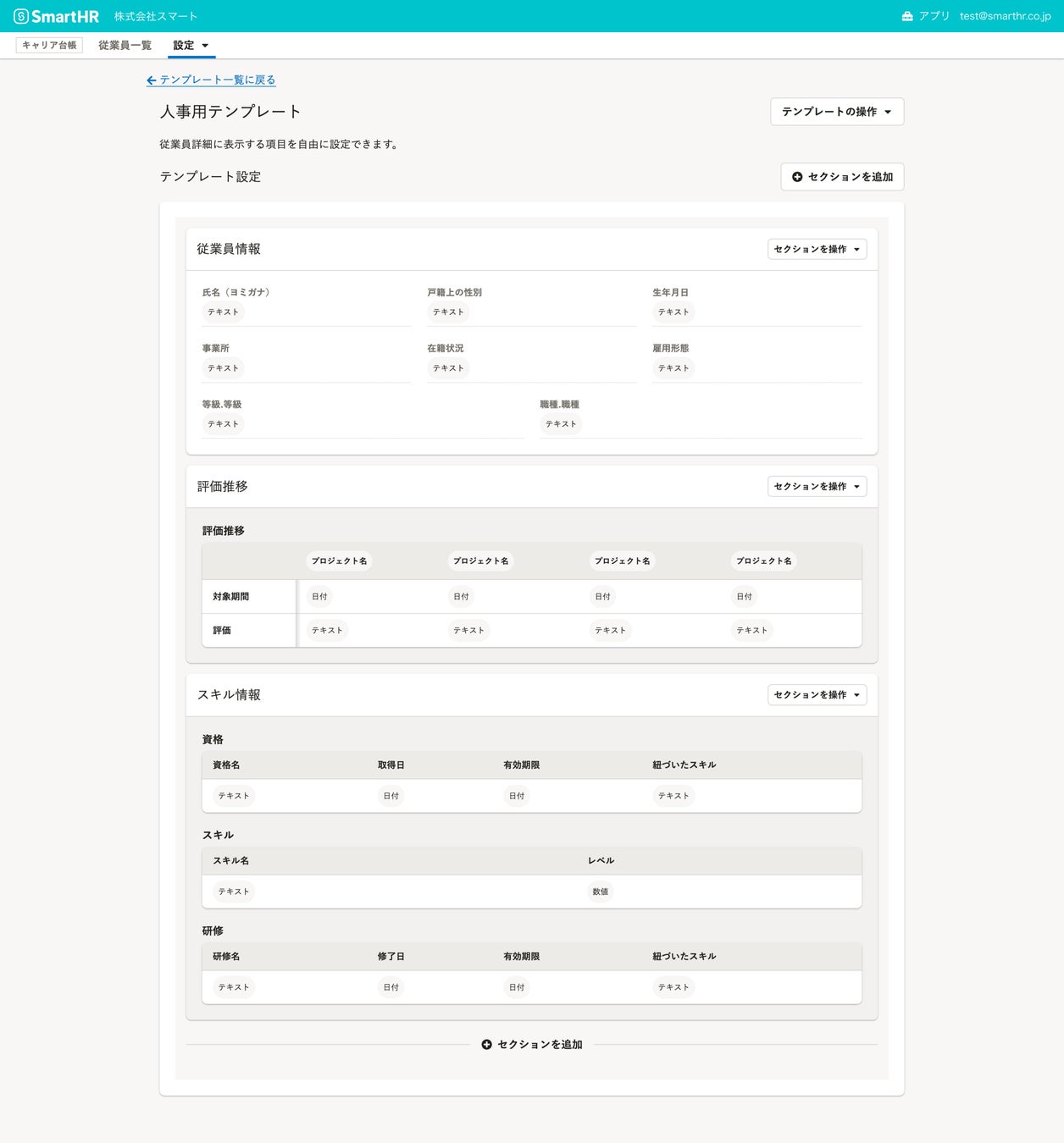 ・セクションでは「キャリア台帳」に連携したい「SmartHR」の機能や表示したい項目の編集が行えます