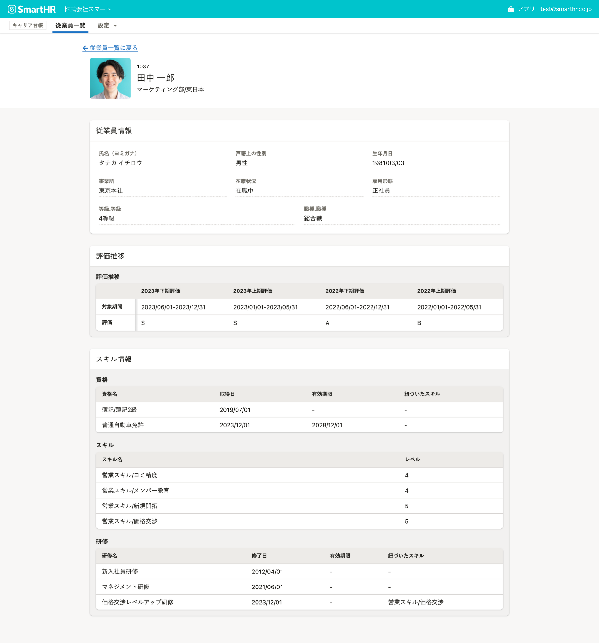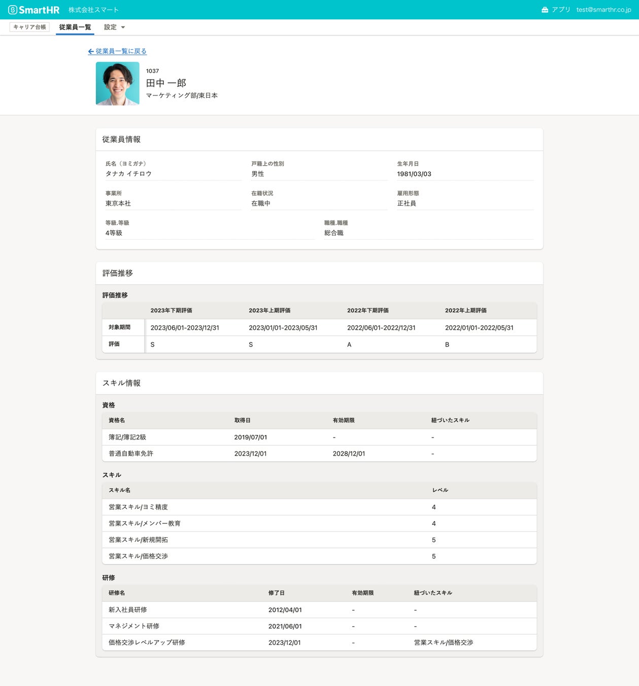 ・人事評価の推移やスキル管理で収集したスキルや資格の情報が表示されます