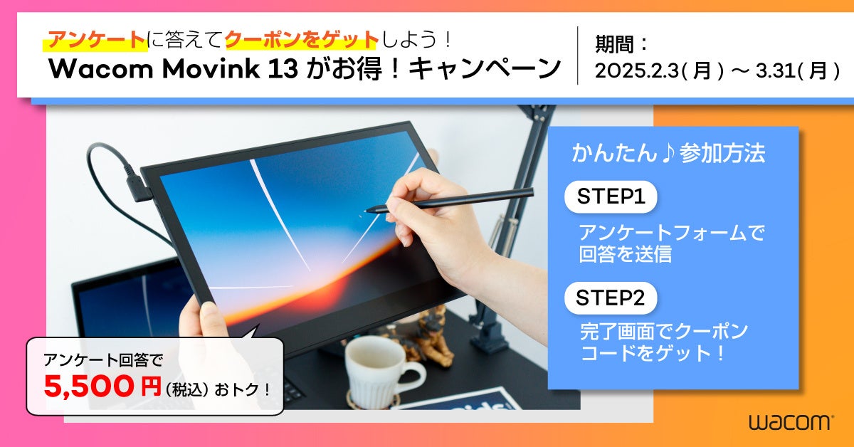 株式会社ワコムは、2025年2月3日(月)から3月31日(月)までの期間限定で、「アンケートに答えてクーポンをゲットしよう!Wacom Movink 13がお得!キャンペーン」を実施します。