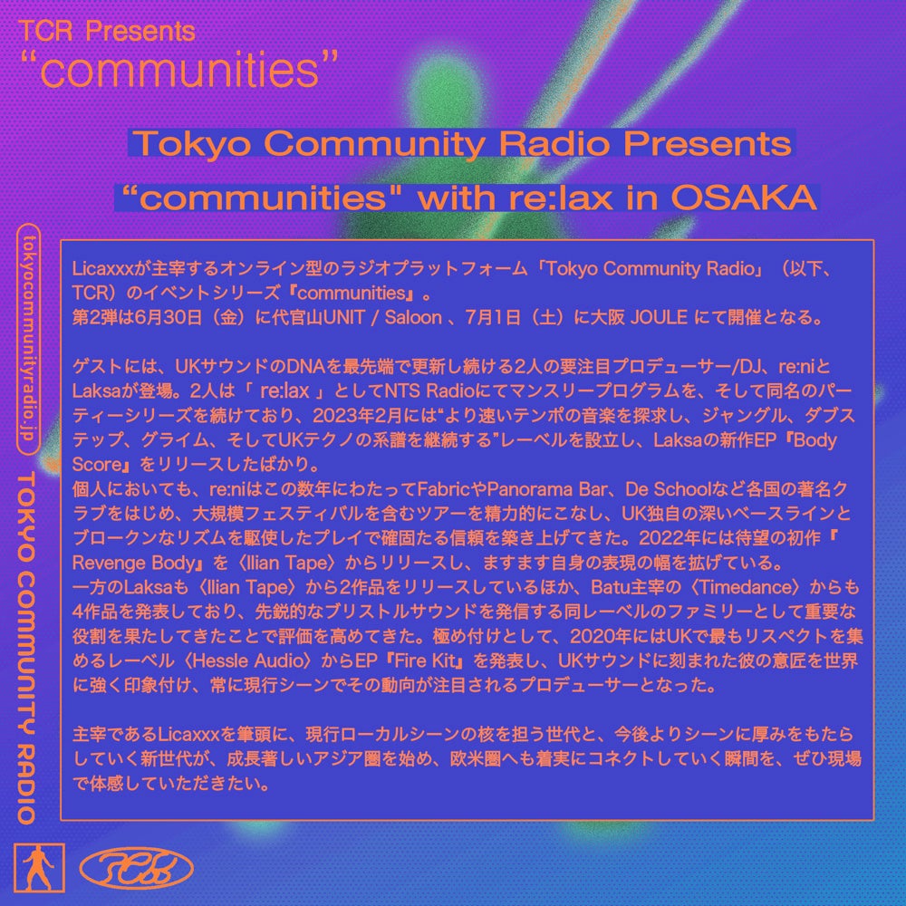 Tokyo Community Radio Presents “communities” with re;lax in OSAKA