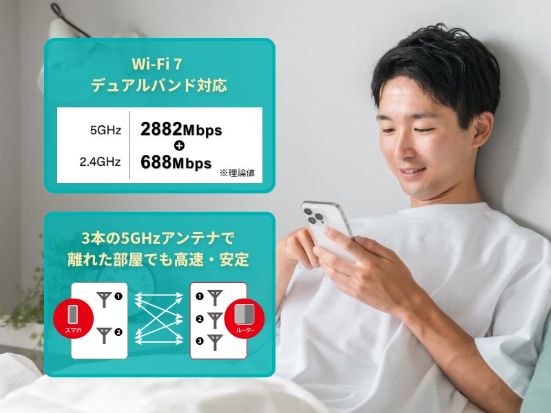 本商品は最新規格「Wi-Fi 7」に対応し、2つの周波数帯(5GHz/2.4GHz)を利用できるデュアルバンドルーターです。5GHzは最大2882Mbps(理論値)、2.4GHzは最大688Mbps(理論値)の高速通信が可能です。