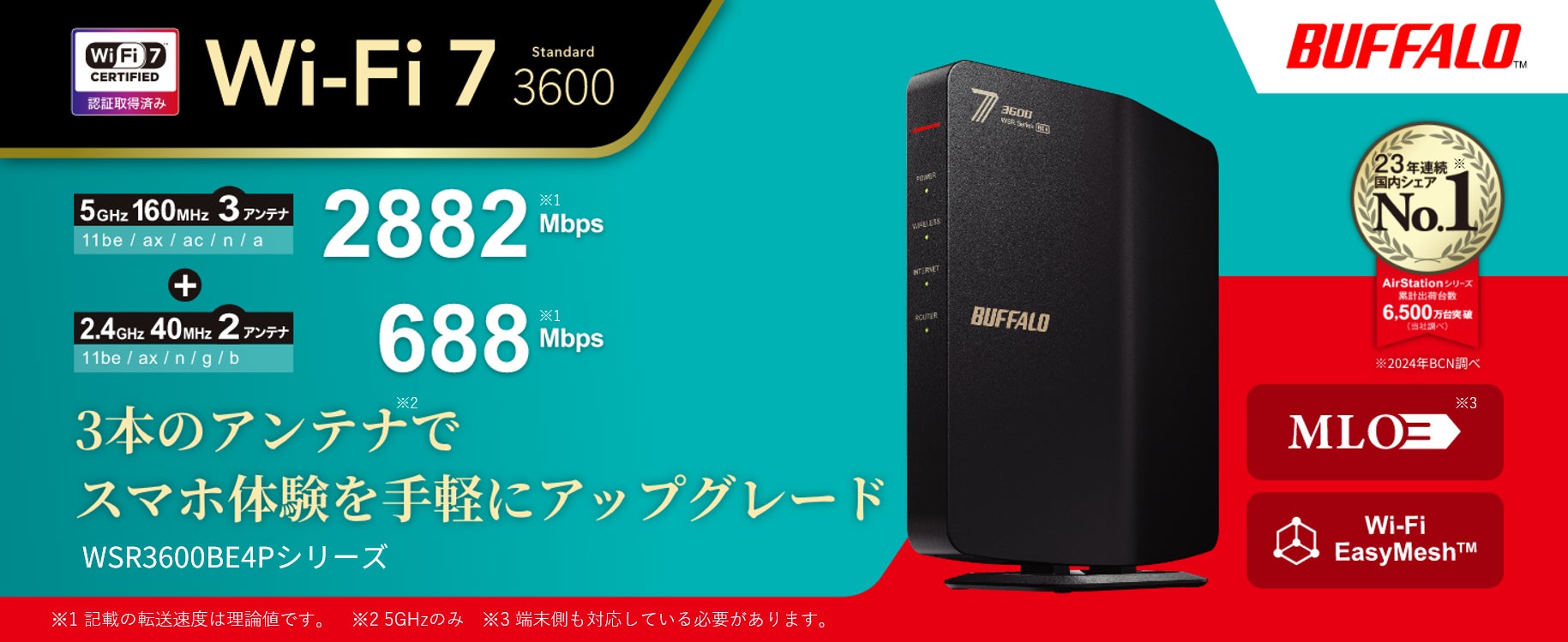 株式会社バッファロー(本社:東京都千代田区、代表取締役 社長執行役員CEO:牧 寛之)は、最新規格「Wi-Fi 7」に対応するデュアルバンドWi-Fiルータースタンダードモデル「WSR3600BE4Pシリーズ」を2025年6月上旬より順次出荷、販売いたします。