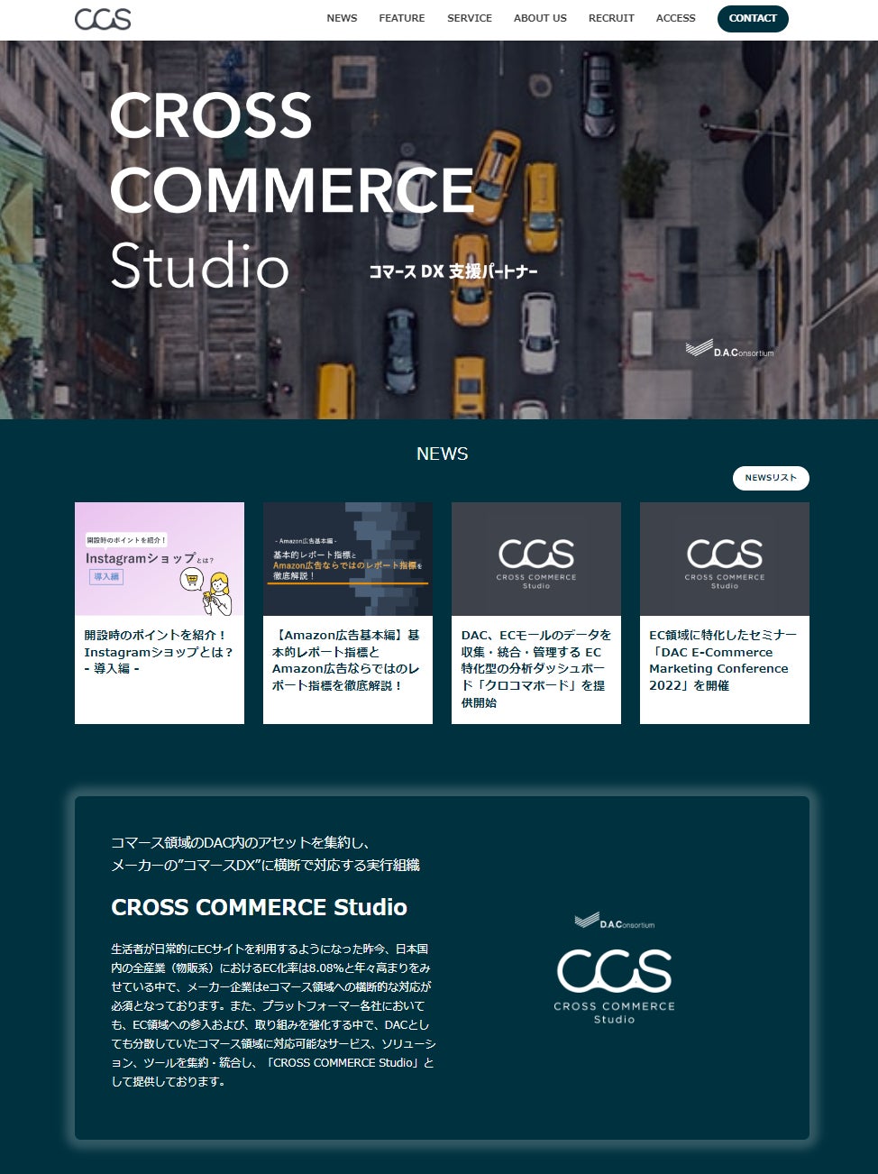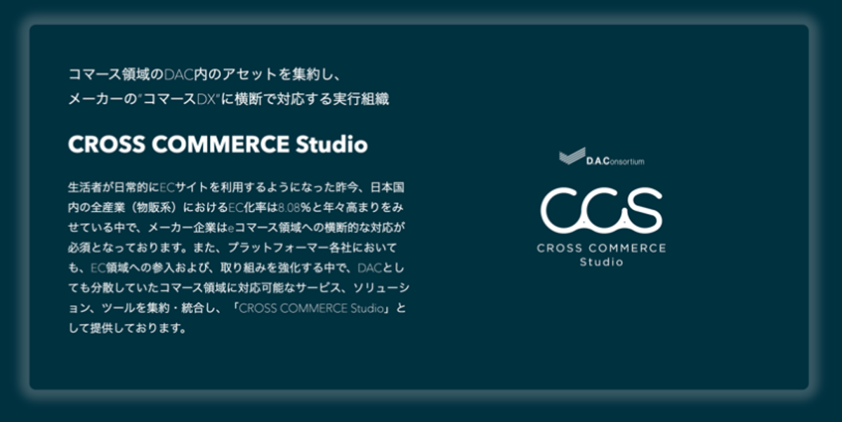 デジタル・アドバタイジング・コンソーシアム株式会社(本社:東京都渋谷区、代表取締役社長 執行役員CEO兼CCO:田中雄三、以下 DAC)のコマースDX横断対応組織「CROSS COMMERCE Studio」は、企業のEC領域のマーケティング活動支援を目的として、EC領域のサービスや情報を総合的に発信するWebサイト(https://solutions.dac.co.jp/ccs/lp)を公開しました。本サービスは、博報堂DYグループのEC領域に特化した組織横断型プロジェクト「HAKUHODO EC+」の取り組みの一環です。