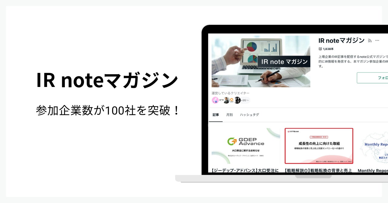 noteが運営する、上場企業が投資家にIR情報を直接届けるメディア「IR noteマガジン」の参加企業が100社を突破したことをお知らせします。noteは「だれもが創作をはじめ、続けられるようにする」というミッションのもと、企業価値の適切な評価につながる情報発信を支援してまいります。
