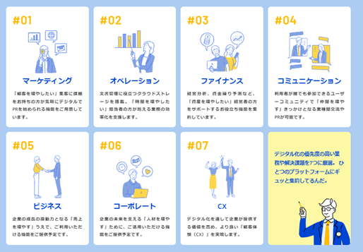 『Hirameki7』(https://www.hirameki7.io/)は、業務効率化から経営改善まで、中小企業が抱えるDX化への悩みを、1つのプラットフォームで管理することで、売上貢献ならびに地方ビジネスの活性化をサポートする中小企業支援プラットフォームサービスです。