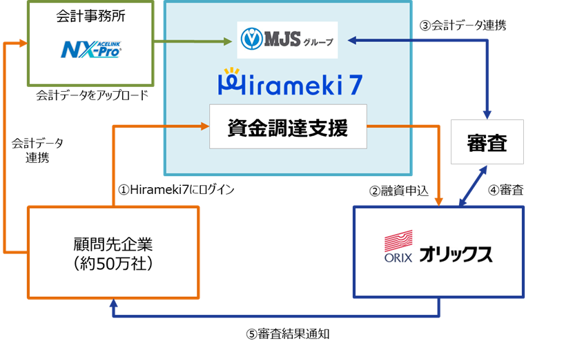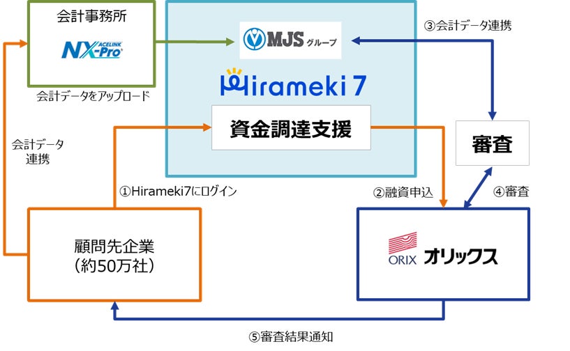 本提携により、MJSの会計事務所向けERPシステム『ACELINK NX-Pro』を利用する会計事務所の顧問先企業(約50万社)は、『Hirameki7』を通じて、オリックスのオンライン融資サービスの利用が可能になります※2。