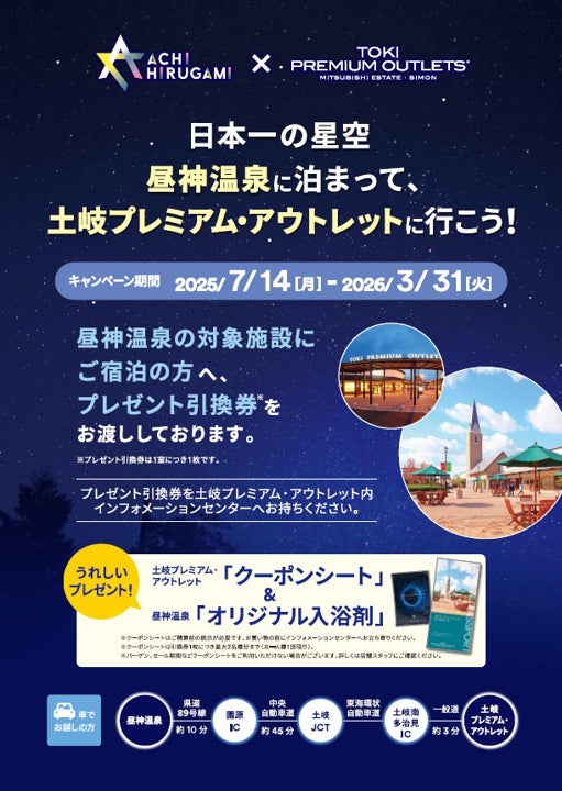 日本一の星空「長野県阿智村」の、株式会社阿智昼神観光局(代表取締役社長:白澤裕次)と、三菱地所・サイモン株式会社(本社:東京都千代田区 代表取締役社長:山岸正紀)の運営する土岐プレミアム・アウトレットは共同で、2025年7月14日(月)~2026年3月31日(火)の期間、「日本一の星空 昼神温泉に泊まって、土岐プレミアム・アウトレットに行こう!」キャンペーンを実施いたします。