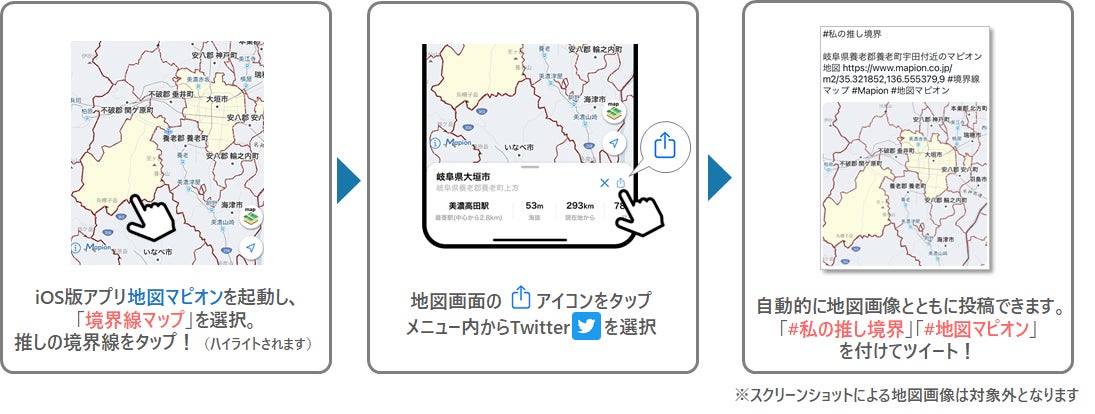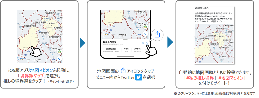 ④地図画像が添付された投稿にハッシュタグ「#私の推し境界」「#地図マピオン」を付けてツイート!