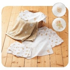 赤ちゃんの入浴に必要なアイテムのセットや、ガーゼが4重になったふんわりやわらかい素材のスタイ3枚組など、赤ちゃんにやさしく使いやすい商品です。