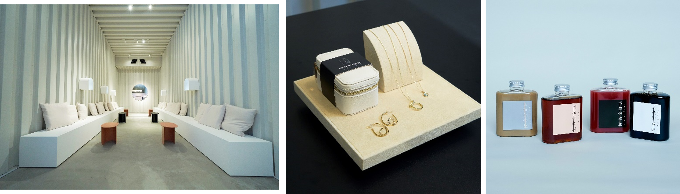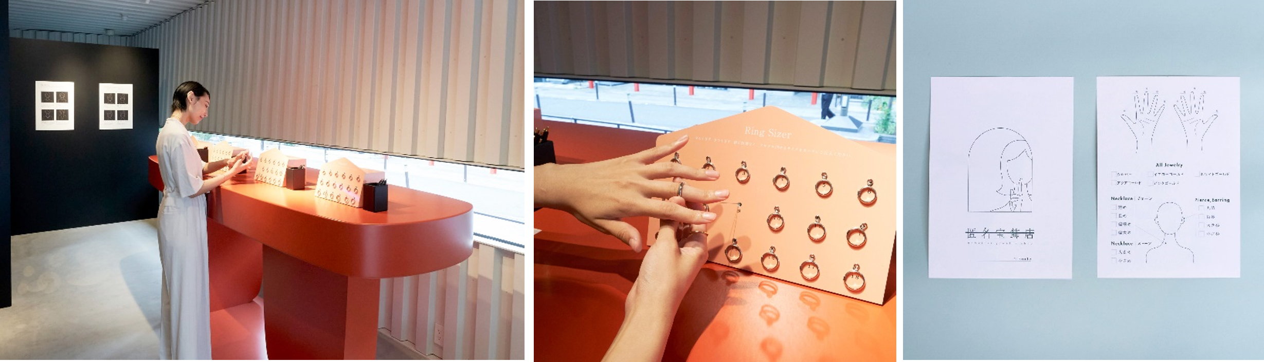 『匿名宝飾店』は、店内が「展示」「試着」「撮影」「購入」などのエリアに分かれています。指のサイズ、パーソナルカラーなどをもとに自分に似合うジュエリーを知るためのジュエリーカルテの作成や、フォルムや着け心地、ジェンダーレスなど8つの展示カテゴリーから自由に手に取りジュエリーの試着体験、そして、ビュッフェ形式でたくさんのジュエリーの中から好きなものを選んで撮影ができるフォトブースなど、さまざまなコンテンツを体験していただけます。また、一部商品はその場で購入することができます。