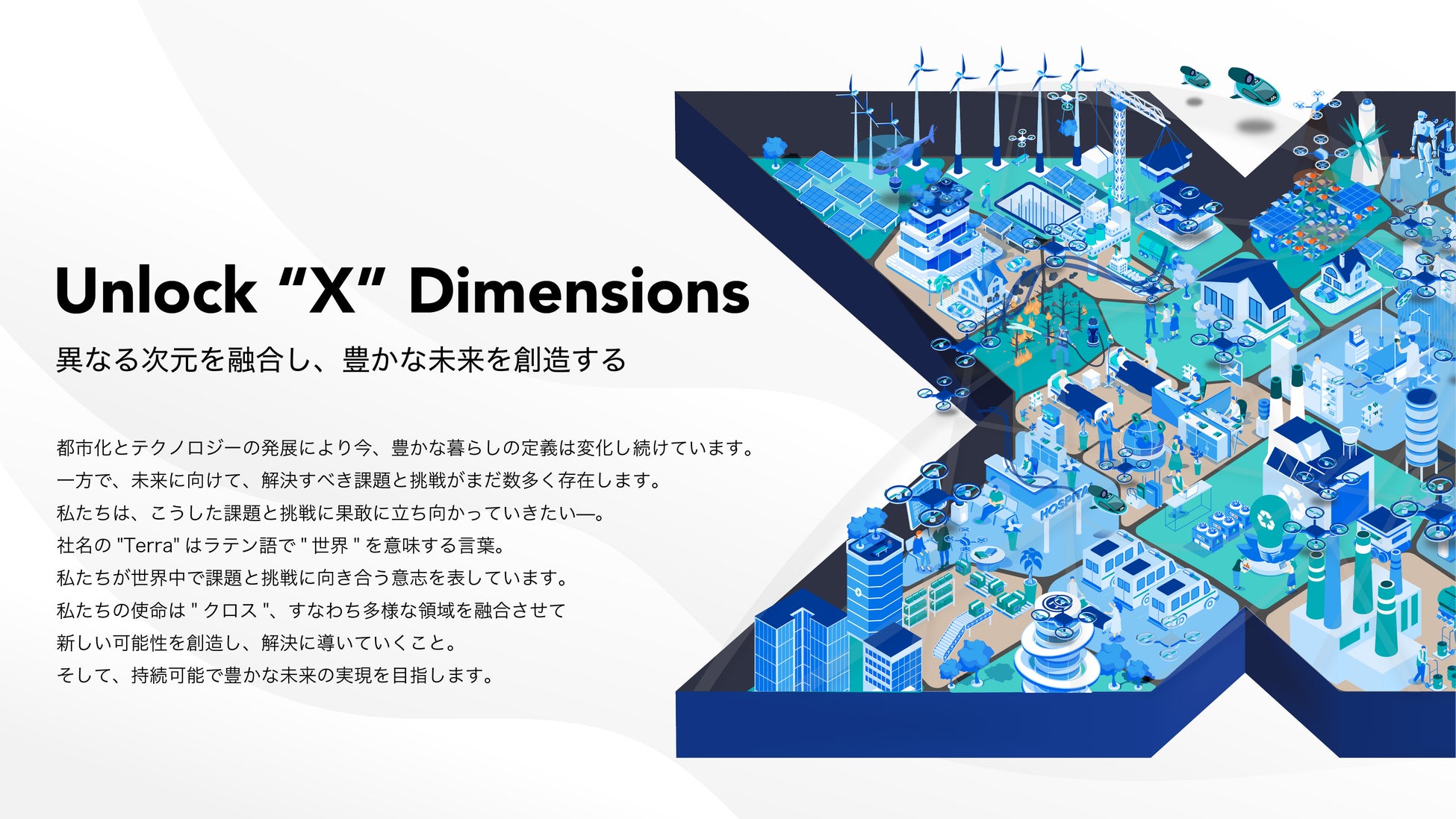 テラドローンは、今まで「空から、世界を進化させる」のミッションを掲げ、国内外の11か国でドローンや空飛ぶクルマなどのエアモビリティのハード・ソフト・サービスにおける全方位的な開発とソリューション提供に取り組み、空のインフラ構築を推進してきました。この経験をもとに、あらゆる領域を融合させて、新たな産業や事業を創造し、社会課題の解決を目指すことで、事業のさらなる発展と社会への新たな価値を提供していきます。「空から、世界を進化させる」という思いは、引き続き事業ミッションとして大切にしていく一方で、「世界で戦う日本企業」として、グローバルにおいても理解しやすく、共感してもらえるよう、新しいコーポレートミッション「Unlock "X" Dimensions」を策定しました。このミッションは、世界5か国にある当社の各拠点の経営陣やメンバーからの意見を反映して設計しています。