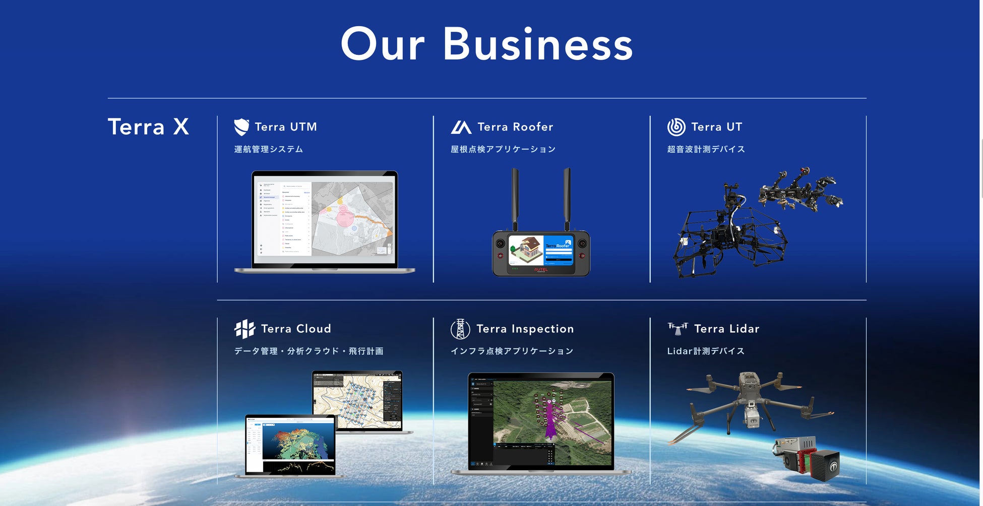 「Unlock "X" Dimentisons(異なる次元を融合し、豊かな未来を創造する)」というミッションを掲げ、東京に本社を置き、国内外の11か国において、自社開発製の特許取得済みである測量用・点検用ドローンを石油ガス・化学・建設業界などへ提供しています。ドローンを用いた非破壊検査作業に関して世界各国での豊富な実績と高い研究開発力を有しています。また、世界8か国で既に導入済みの運航管理(UTM)を展開。空飛ぶクルマやドローンの開発及びソリューションを提供するドローンサービスプロバイダーです。詳しくは http://www.terra-drone.net