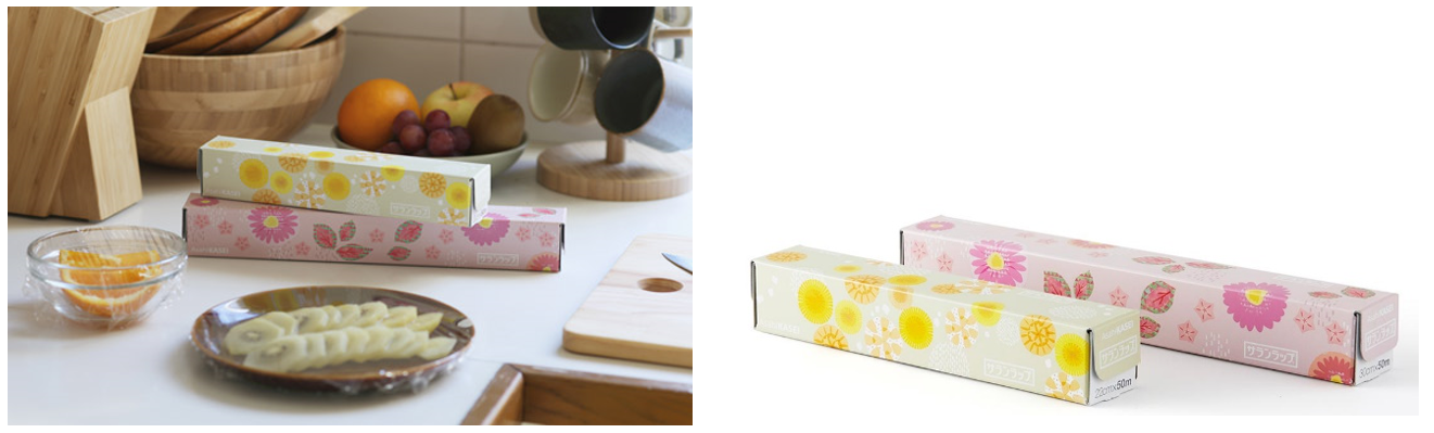 切りやすさや高いバリア性はそのままに、ピタっと密着する「サランラップ」から、明るく華やかなフラワーデザインが登場。パッケージには、健康・元気・幸福・笑顔など、ポジティブな花言葉をもつ花々をあしらいました。ラップケースを使用しなくても生活感が出にくく、見せる収納が可能です。フラワーデザインが、明るい雰囲気のキッチンづくりをお手伝いします。