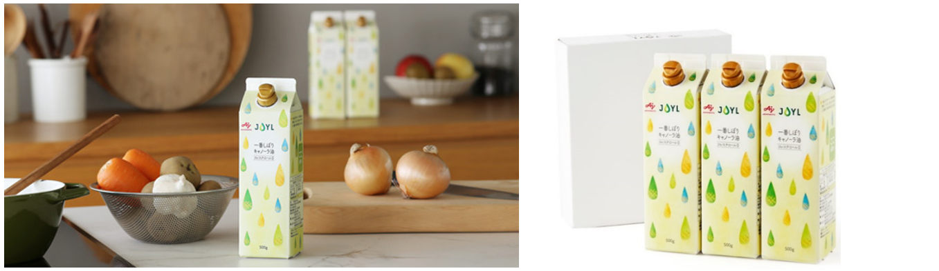 一番しぼりのキャノーラ油のみを使用したコレステロール0のサラダ油。本体容器をプラスチックボトルから紙パックにすることで、従来の容器と比べて約60%のプラスチック使用量削減を実現。CO2は、約26%の削減見込 (メーカー計算、600gPET比)。注ぐ量が選べるW構造のキャップ。紙容器 は酵素バリア性・遮光性に優れた素材の多層構造で、開封前賞味期限が従来のプラスチックボトルに比べ2年と長持ち。パッケージは、一番しぼりの油滴をモチーフにしたデザイン。毎日使うサラダ油なので、毎回しまうことなくキッチンに置いておける明るいデザインを目指しました。場所も取らない角形なのでストック性にも優れ、使用後は小さく畳んで捨てられます。