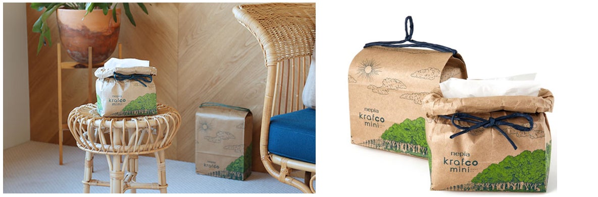 大人気の「nepia krafco」にミニサイズが仲間入り。全て紙の(脱フィルム※/ごみ量削減につながる)クラフト包装型のティシュ。ティッシュをそのまま取り出せ、減りに合わせてクラフト紙を巻けば、形状変化を楽しみながらご使用いただけます。紙紐を使ってキッチンや洗面所でフックに引っ掛けて使える、置き場所を選ばないサイズ感です。パッケージは、森のサイクル(蒔いた種が芽・花・木・森へと育ち循環する)が描かれたデザイン。