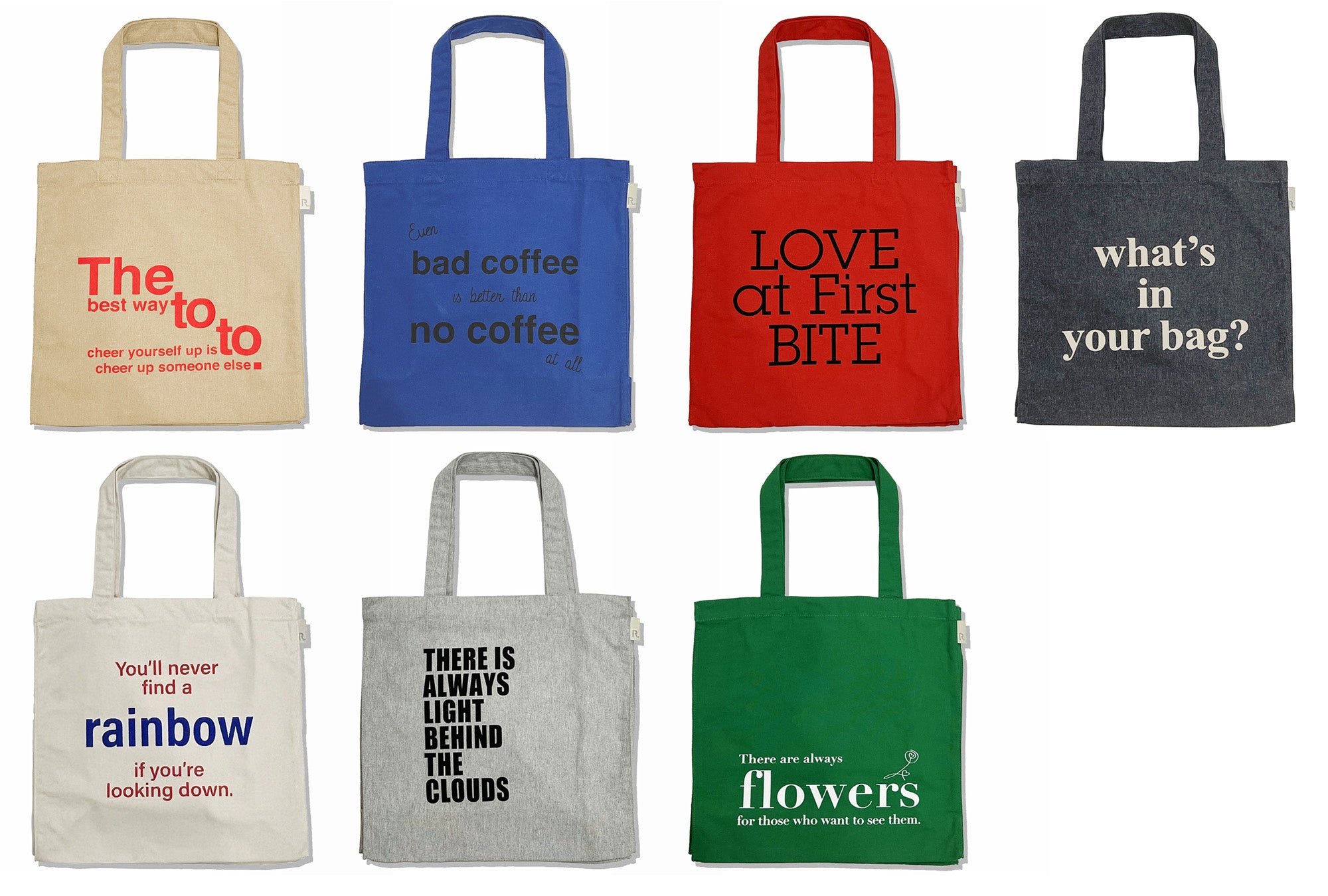語録やもじり言葉など、キラッと光るウイットに富んだ言葉をタイポグラフィで表現しました。見た目も楽しいカラフルでポップなエコトート。幅広マチで荷物をたっぷり収納できるボックス型です。