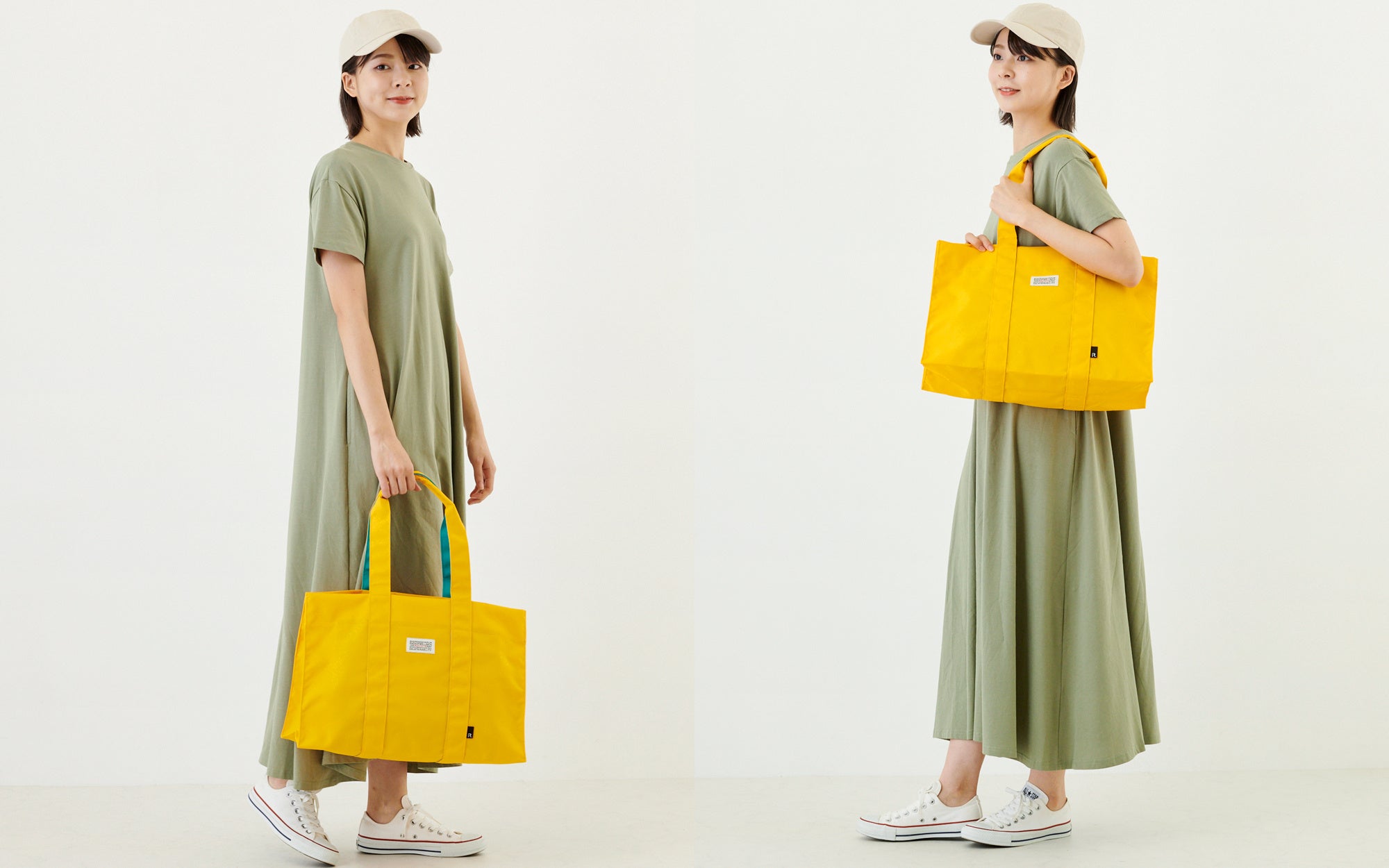 パッと目を引くポジティブなカラーリング。ルーポケットの配色がアクセントになっています。持つことで気持ちも明るく、お出かけも楽しくなるような元気をくれるトートです。