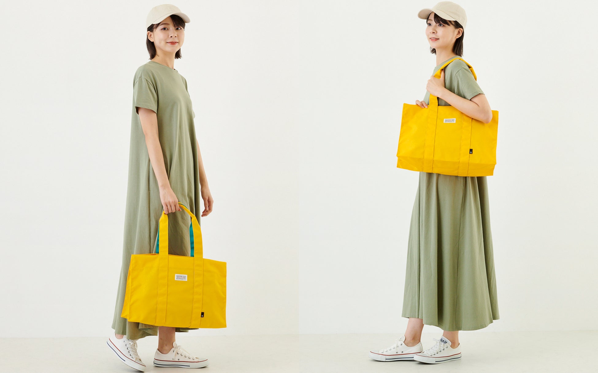 コットンのような風合いのリサイクルペット素材のトート。コンパクトに携帯できます。