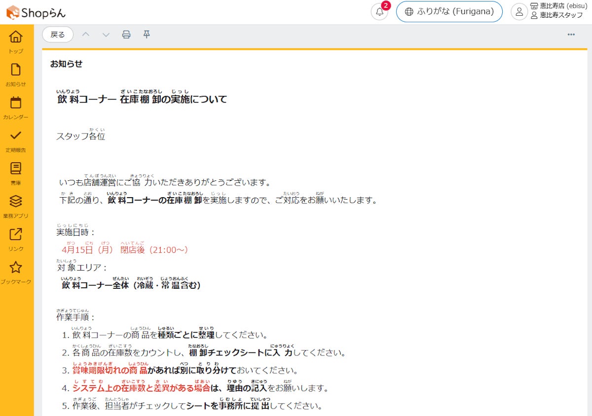 当社は、20年以上にわたり稼働したシステムのリプレイスを機に、本部・店舗間のコミュニケーションのあり方を刷新しています。 Shopらん(R)の導入により、情報の優先度や期限が可視化され、店舗とスーパーバイザーの連携がこれまで以上に円滑化することで、現場の「実行力」向上が期待されます。