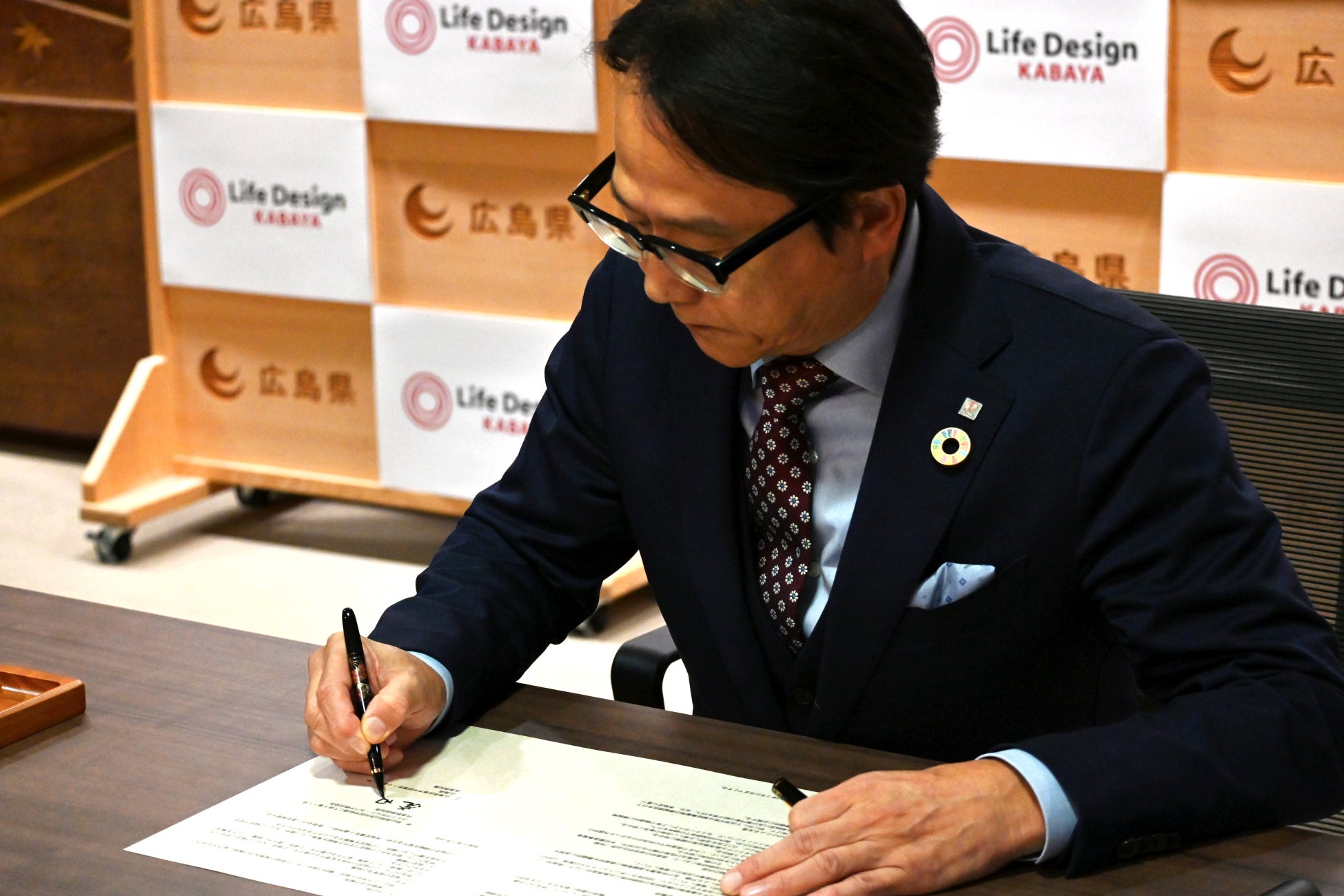 2024年11月18日(月)に広島県庁にて締結式が執り行われ、湯﨑英彦知事(広島県)、窪田健太郎(ライフデザイン・カバヤ株式会社 代表取締役社長)をはじめとする5名が出席しました。