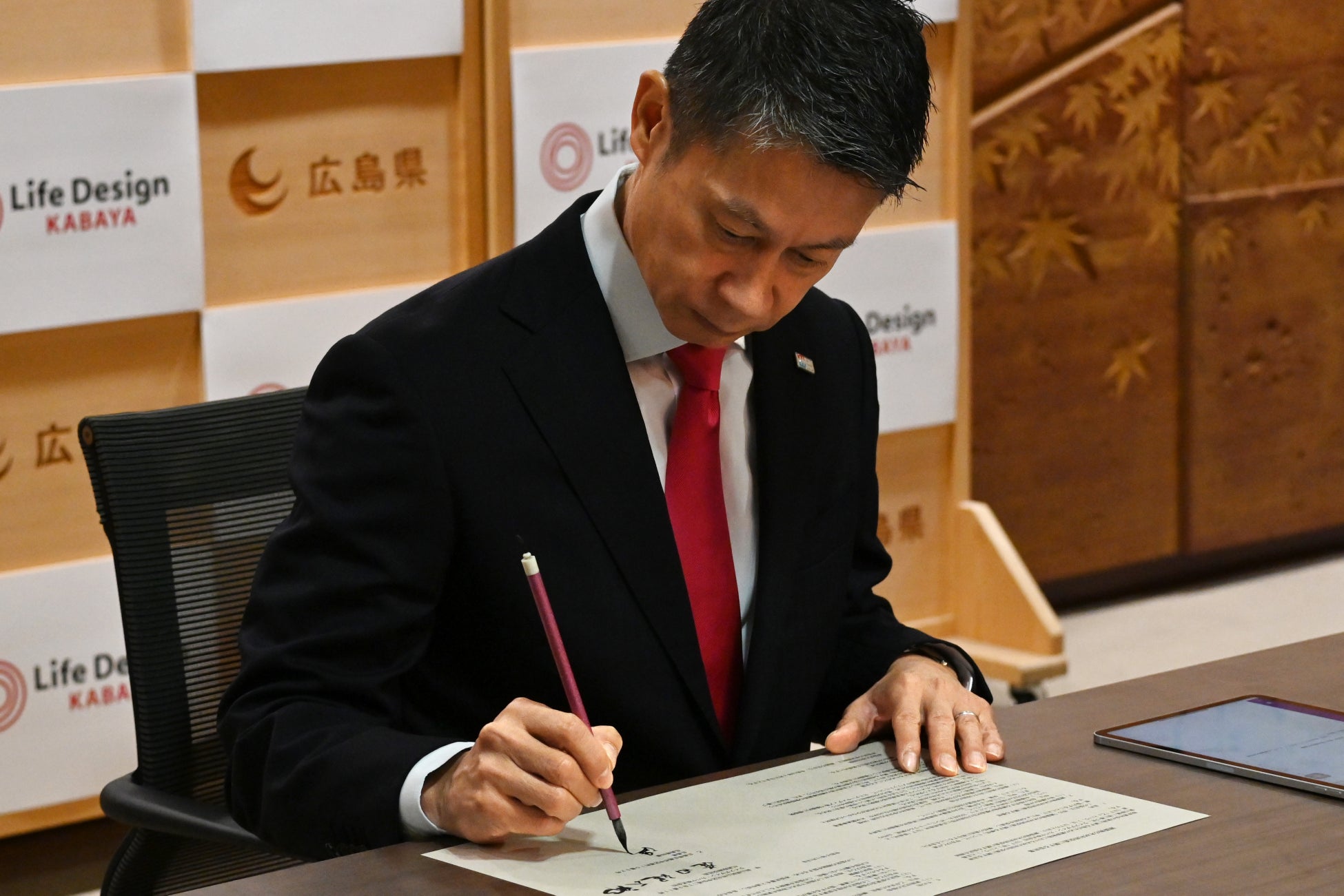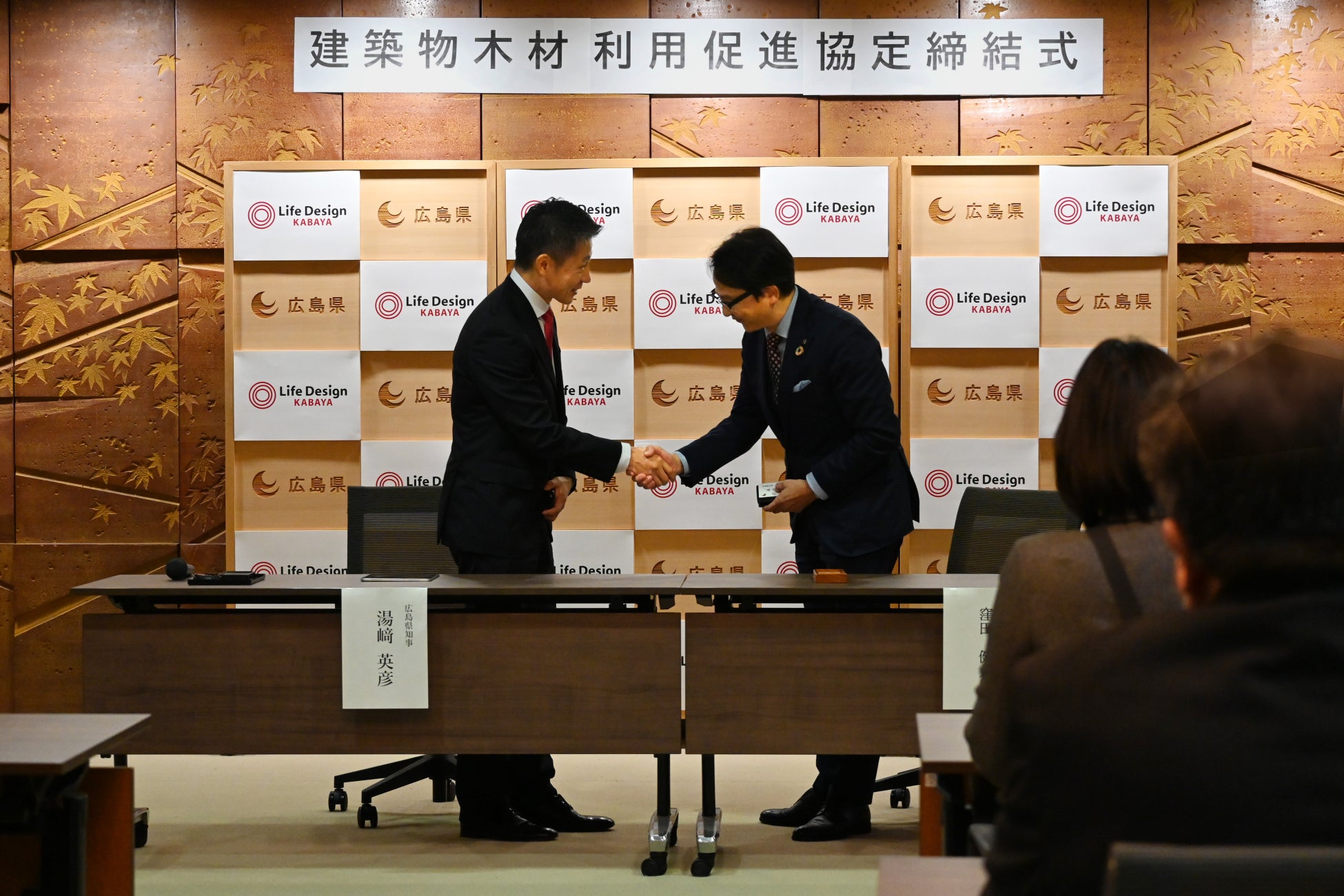 締結式にて湯﨑知事は、「戦後植林された広島県内の森林資源は本格的な利用期を迎えており、広島県産材の利用は“伐って、使って、植える”一連の森林循環を通じて森林の二酸化炭素吸収作用を強化し、炭素固定の効果を発揮するなど、脱炭素社会の実現にも貢献している。そのため広島県では、生産された県産材の利用を促進する『森林資源利用フローの推進』に向けて、建築物における県産材の利用の促進に取り組んでいく所存であり、ライフデザイン・カバヤには協定締結を機に広島県の森林・林業施策の推進に一層の協力を期待する」とコメント。