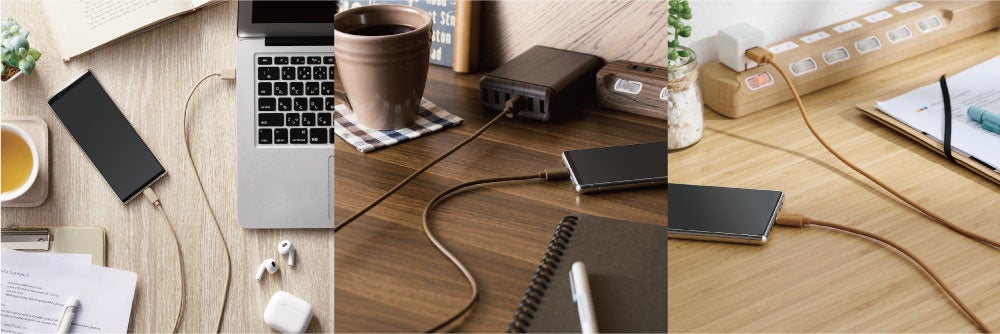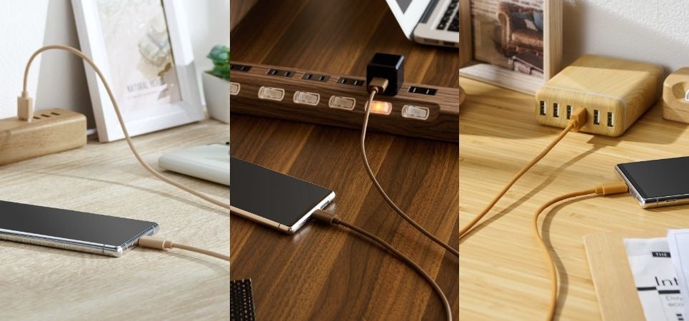 ケーブルの仕分けにも便利!木目調インテリアのお部屋に馴染む、ナチュラルな3色×4種類のカラーケーブルを新発売