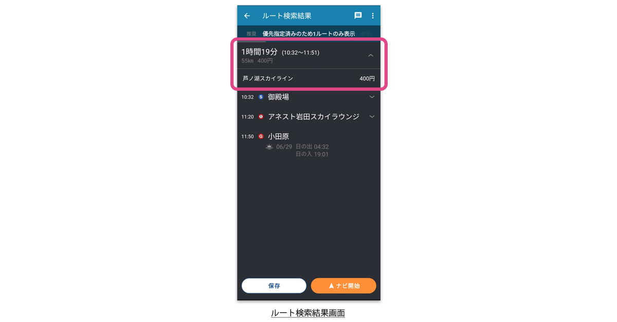 ユーザーは、あらかじめルート検索条件設定にてユーザーが指定した排気量に応じた通行料金※2を、ルート検索結果画面上で、確認できます。