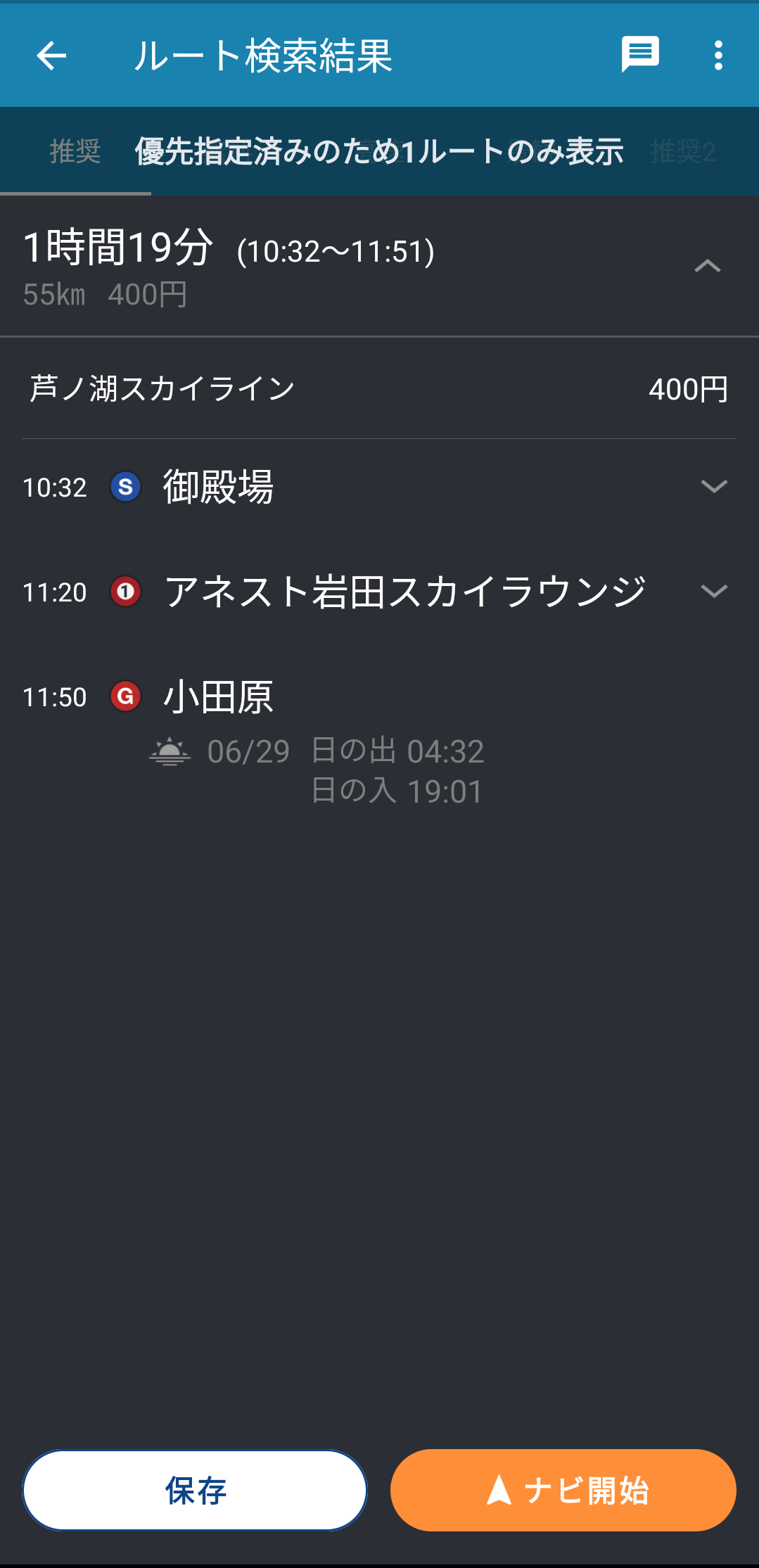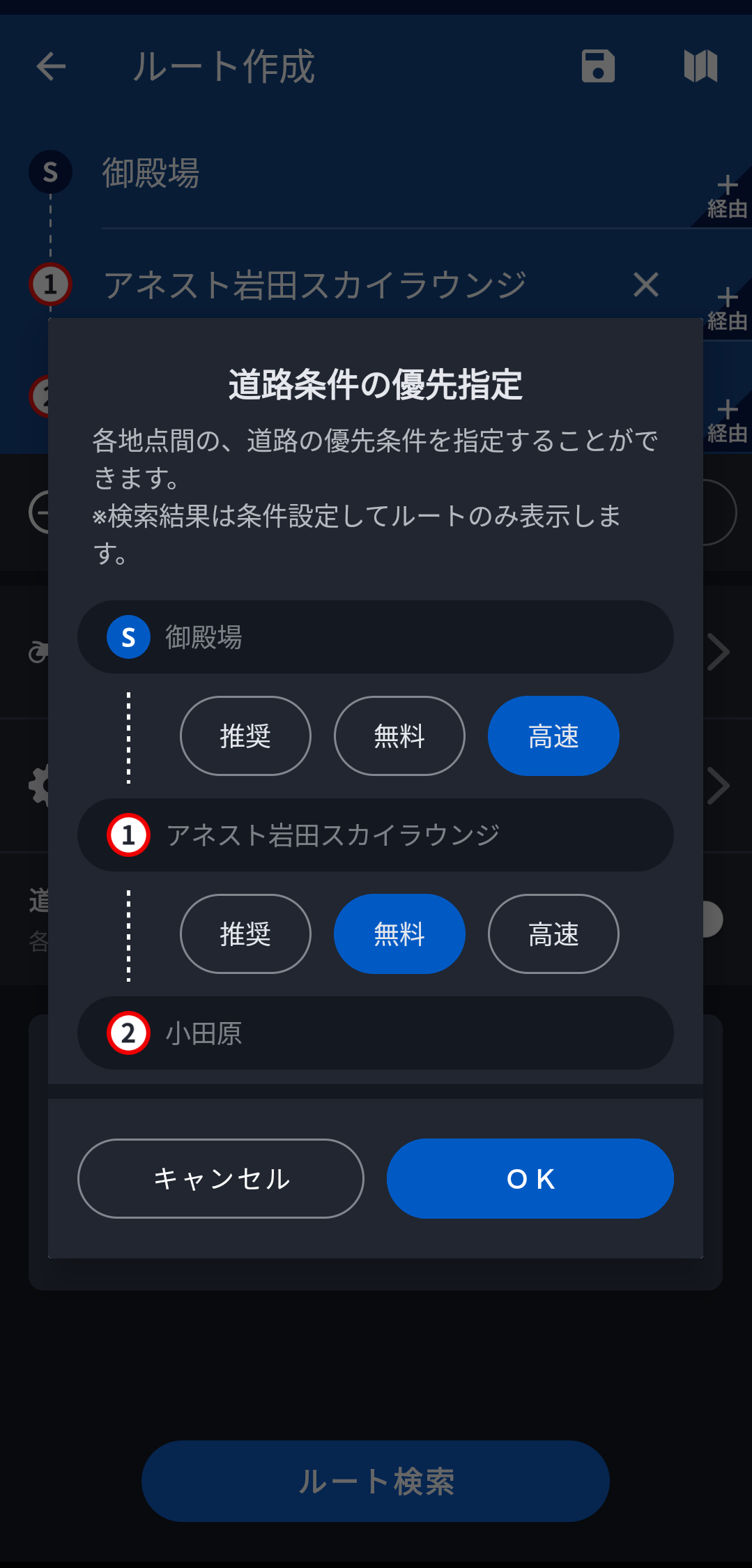 ユーザーからも「自由にツーリングルートを作成する際、経由地区間毎に高速道路を使うか、使わないかの細かい設定を入れたい」という要望をいただいていました。また、上記料金情報の整備を行ったことからも、経由地区間毎の料金情報を考慮したルート選択が可能となりました。