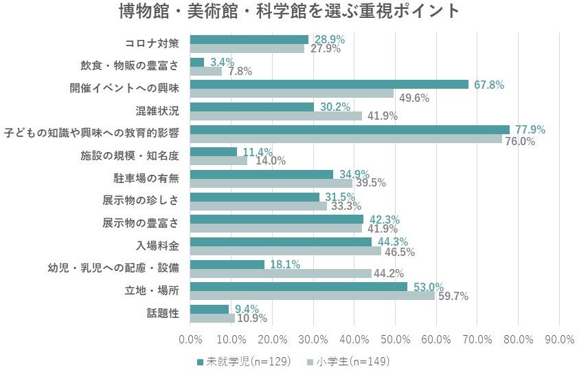 - 博物館・美術館・科学館を選ぶときの重視ポイントは、未就学児・小学生ともに「子どもの知識や興味への教育的影響」が1位。「開催イベントへの興味」は小学生のほうが多く、「幼児・乳児への配慮」「混雑状況」は未就学児のほうが多い結果に。「入場料金」は両方それほど重視されていない