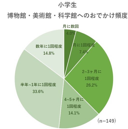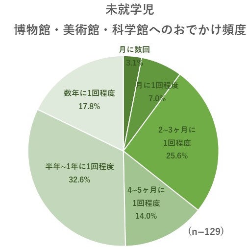 - 博物館・美術館・科学館へのおでかけ頻度は未就学児・小学生で差はなく「半年~1年に1回程度」が30%、「2~3ヶ月に1回程度」が25%
