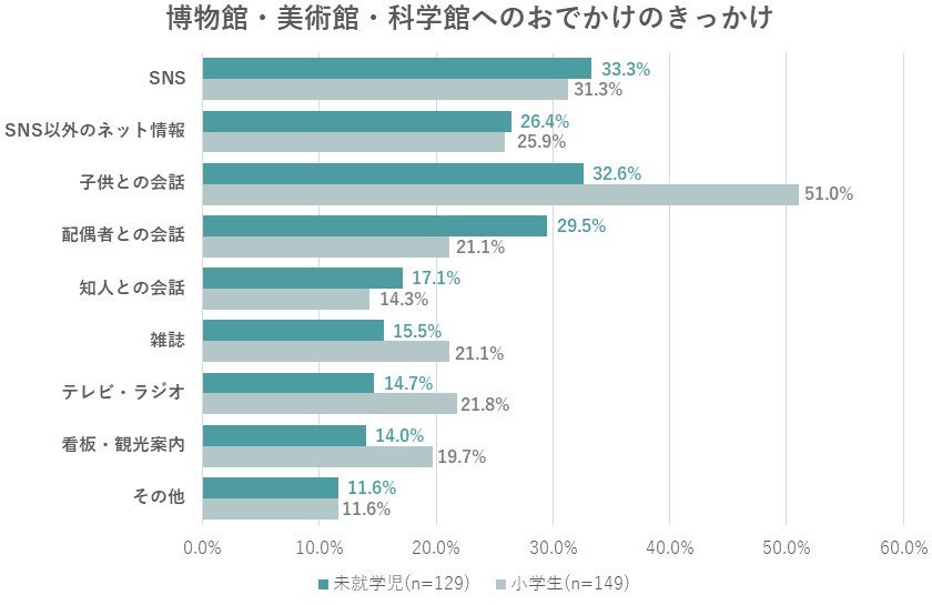 - 博物館・美術館・科学館へのおでかけを決めたきっかけでもっとも多かった回答は、未就学児が「SNS」、小学生は「子供との会話」