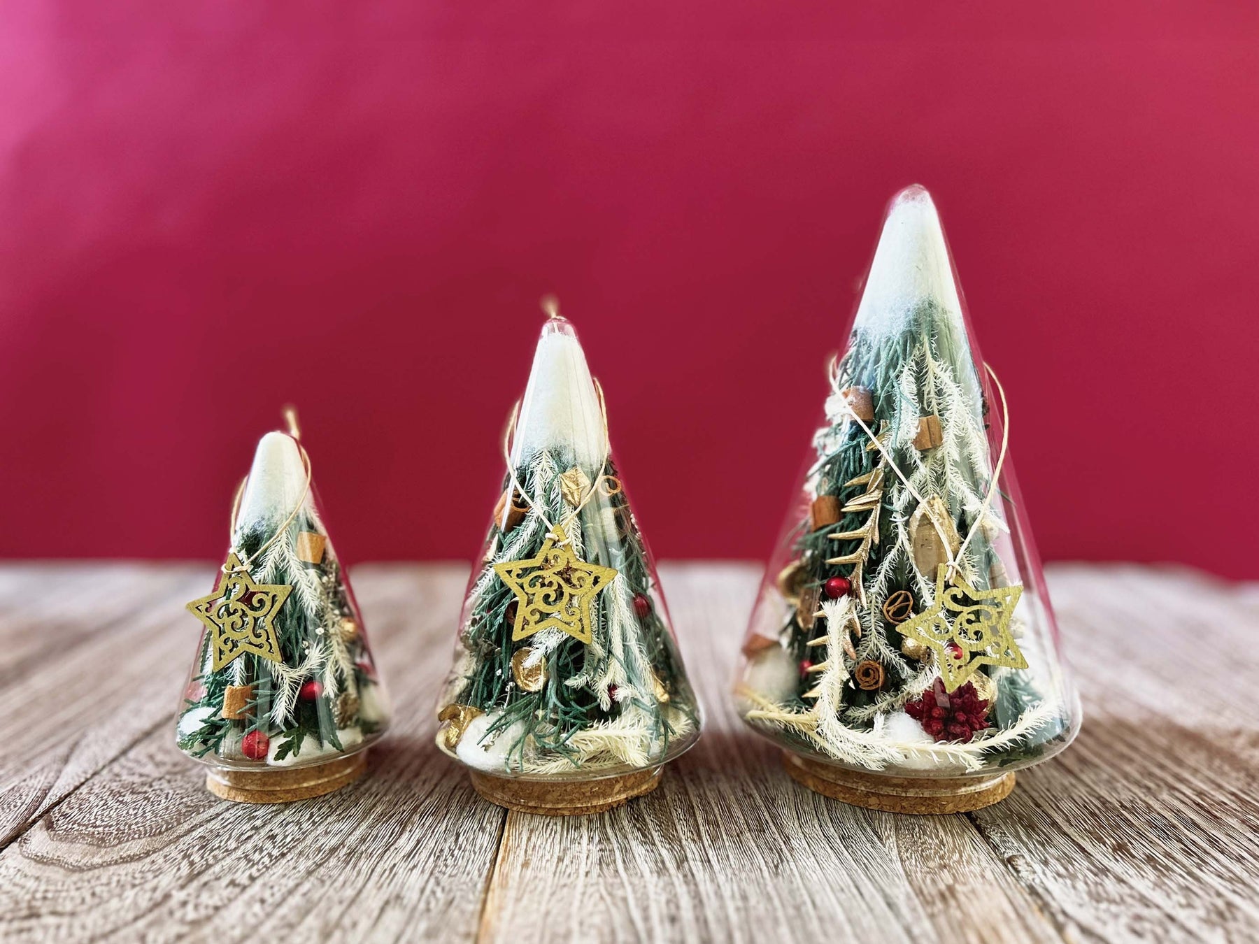 ツリー型のガラスの中に、小さなもみの木をアレンジしました。雪がつもった演出までフローリストがこだわって手作りしています。