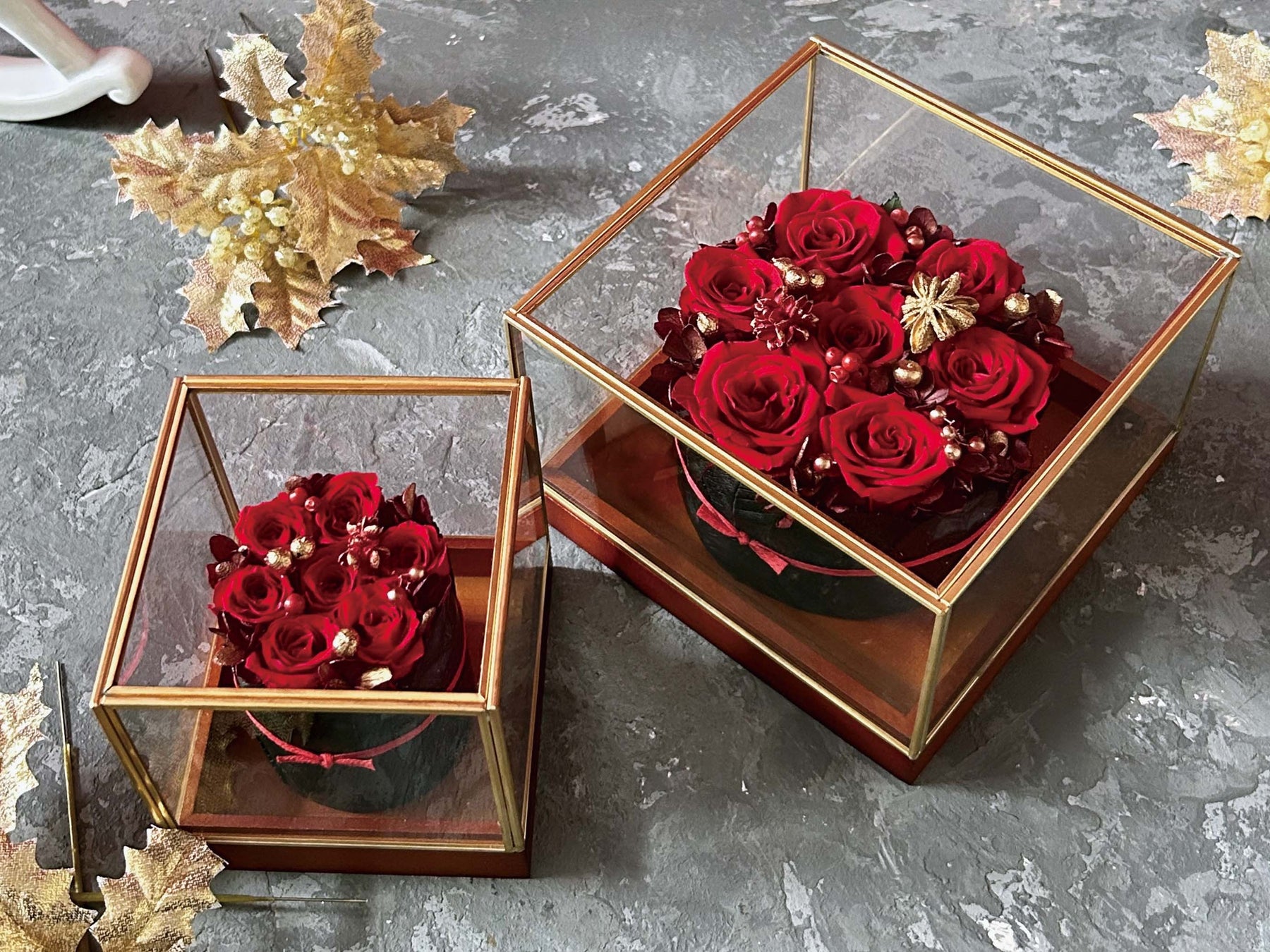 真っ赤なバラを敷き詰めた「タルトケーキ」のようなデザインのプリザーブドフラワーのアレンジメント。木製の土台にアレンジメントは固定。取り外し可能なスクエア型ガラスケースで閉じ込めています。