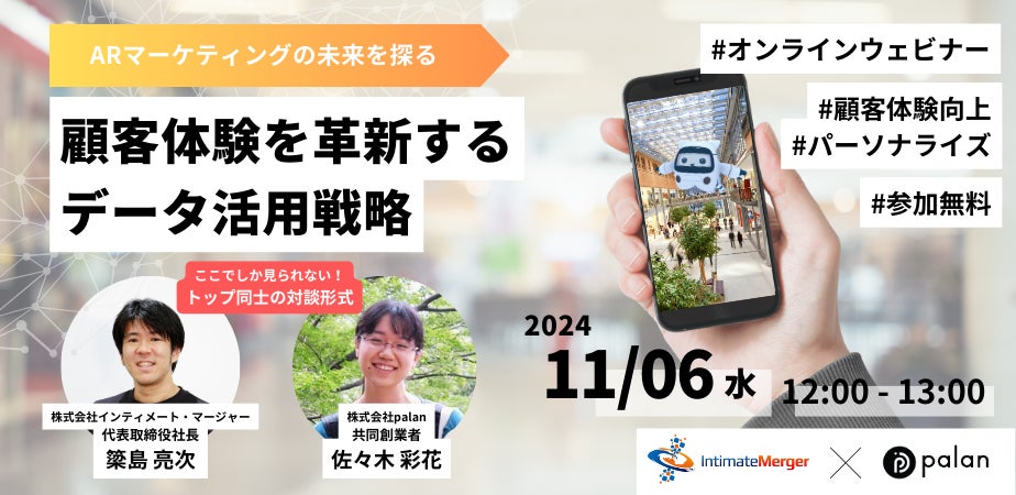 株式会社インティメート・マージャーと株式会社palanが共催する本セミナーでは、『ARマーケティングの未来:顧客体験を革新するデータ活用戦略』をテーマに、最新のAR技術とデータ分析によるマーケティングの新たな可能性を探ります。