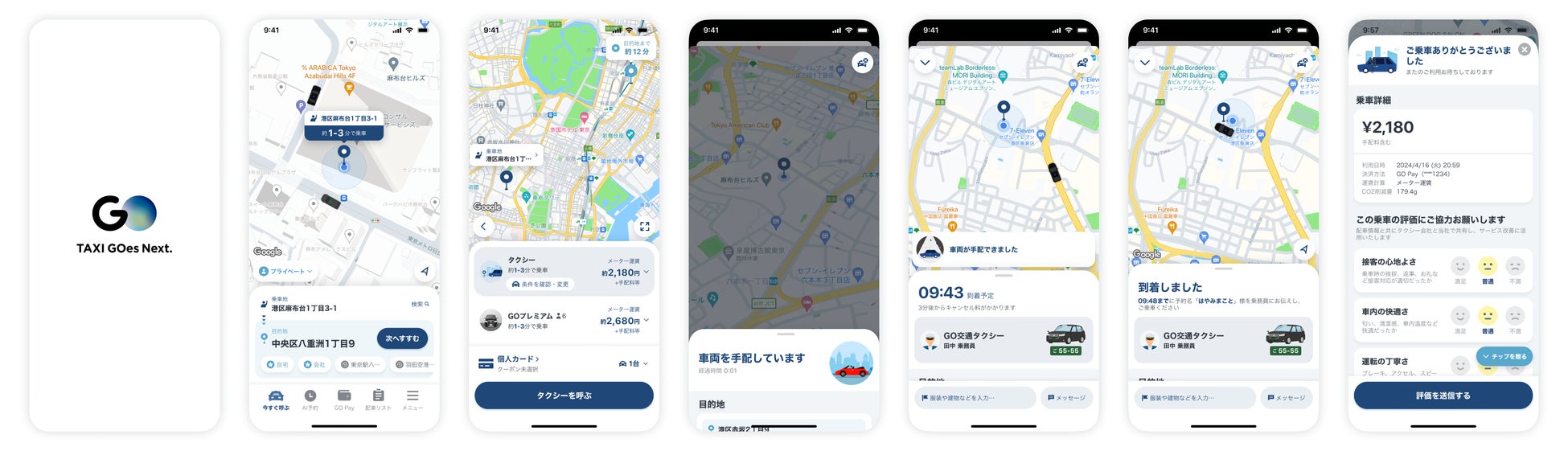 1.タクシーなどの配車(今すぐ呼ぶ/事前確定運賃/AI予約/複数台など) 2.お支払い手段の事前登録による配車時及び車載タブレットでのGO Pay 3.電子領収書発行 ※一部機能は一部地域での提供 |