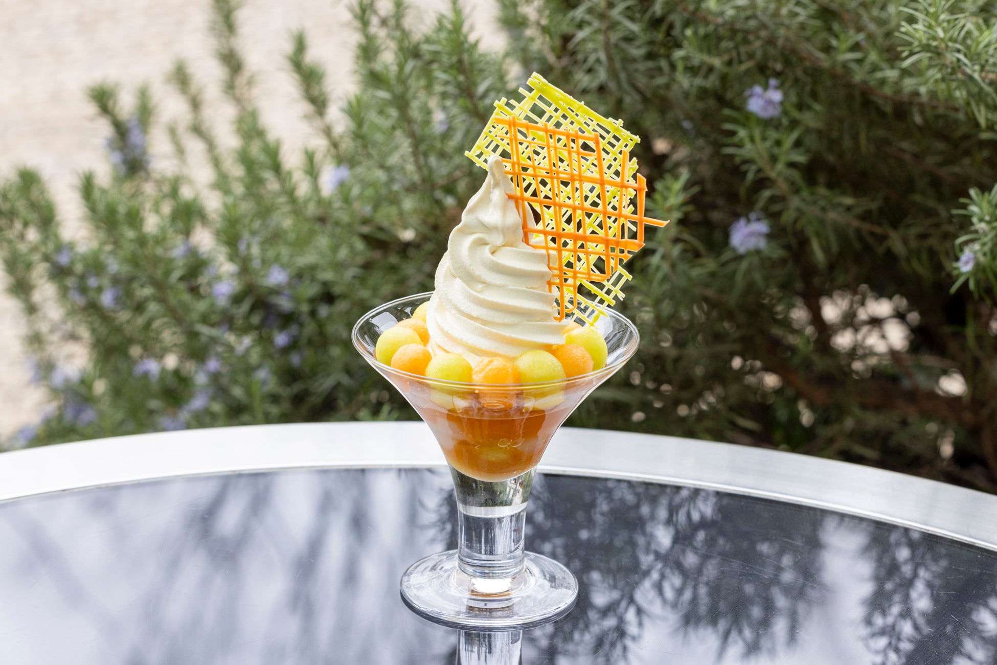 オーセンティックかつ旬の素材を生かしたモダンなイタリアン カフェ「フィオレンティーナ」では、アイスクリームをつかった2種類のフローズンスイーツをご用意いたします。フローズンヨーグルトパルフェは、ヨーグルトアイスの酸味がメロンの甘さを引き立てる夏らしい味わいのパルフェです。グラスの中に、丸くくり抜いたオレンジとライトグリーン2色のメロンと、ハーブのような風味が特徴のマヌカハニー、ナタデココとメロンのゼリー、そして、サクサクとした歯ざわりも楽しいココナッツチュイールをレイヤー状に重ね仕上げます。フローズンパスタは、バニラアイスをプレス機でパスタ状に絞り、上からトマトソースを思わせる真っ赤なラズベリーソースと、パルミジャーノチーズをイメージしたココナッツロングをトッピングした遊び心あふれるユニークな一品。フィオレンティーナが手掛ける夏だけのフローズンスイーツを心地良い風が吹き抜ける開放的なテラスでもお楽しみください。