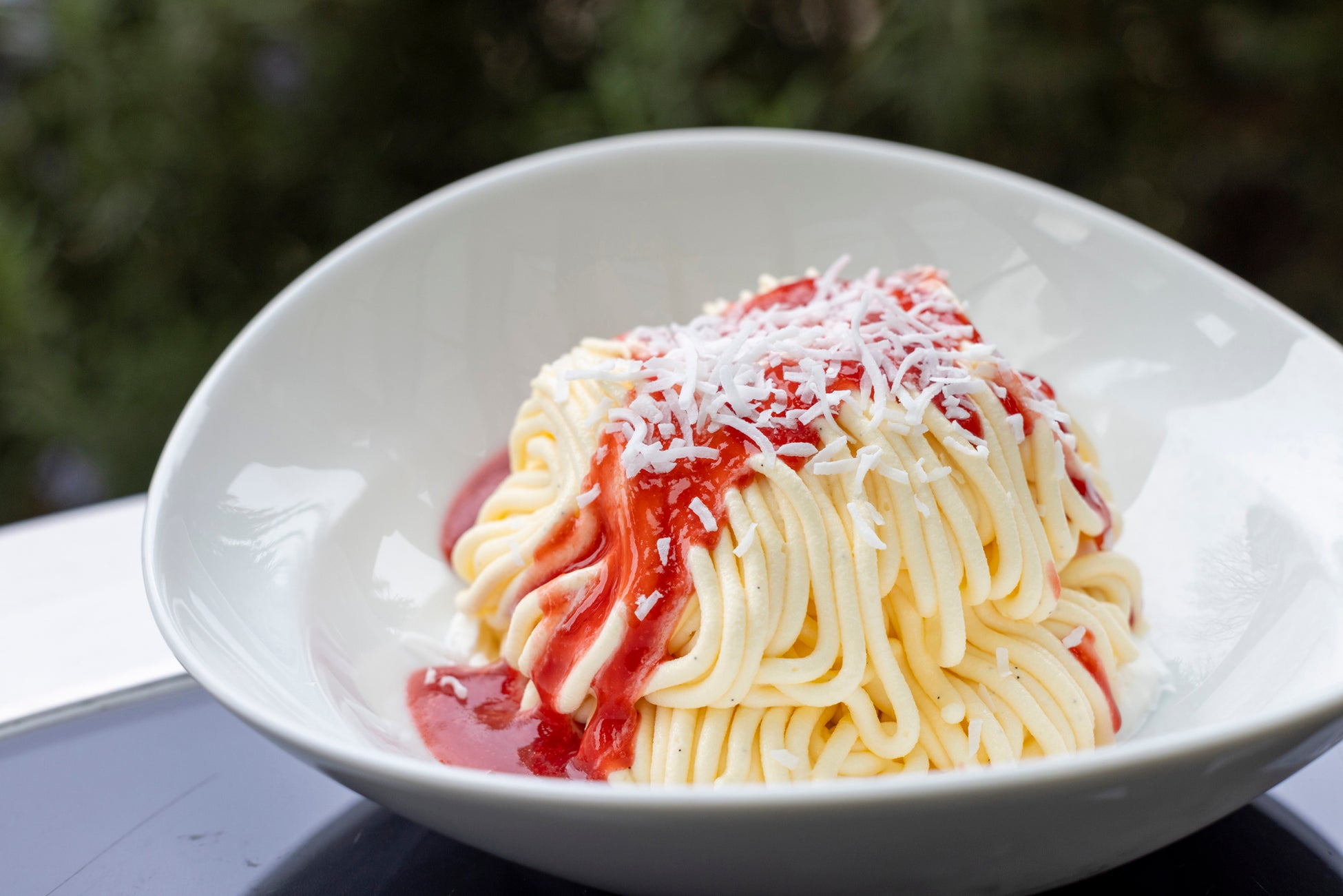 イタリアン カフェ「フィオレンティーナ」では、アイスクリームをつかったフローズンデザートが2種類登場い たします。フローズンヨーグルトパルフェは、ヨーグルトの酸味がメロンの芳醇な甘みを引き立たせる夏らしい爽やかな味わいです。ハーブのような風味が特徴のマヌカハニー、ナタデココとメロンのゼリー、サクサクとした歯ざわりのココナッツチュイールが絶妙なバランスでハーモニーを奏でるパフェをご堪能ください。フローズンパスタは、バニラアイスをプレス機でパスタ状に絞り、上からトマトソースを思わせる真っ赤なラズベリーソースと、パルミジャーノチーズをイメージしたココナッツロングをトッピングした、イタリアンの定番のトマトソースパスタをアイスクリームで表現した、シェフの遊び心が感じられるユニークなデザートです。